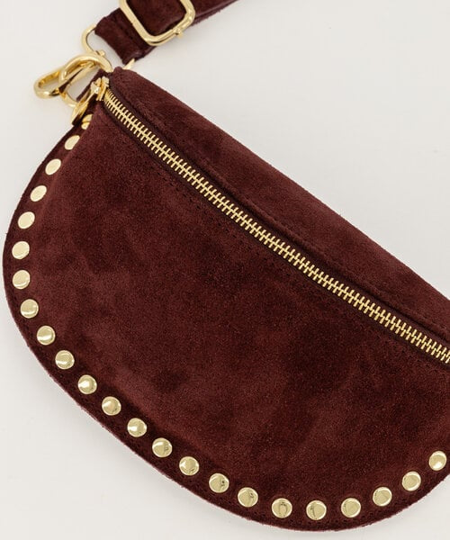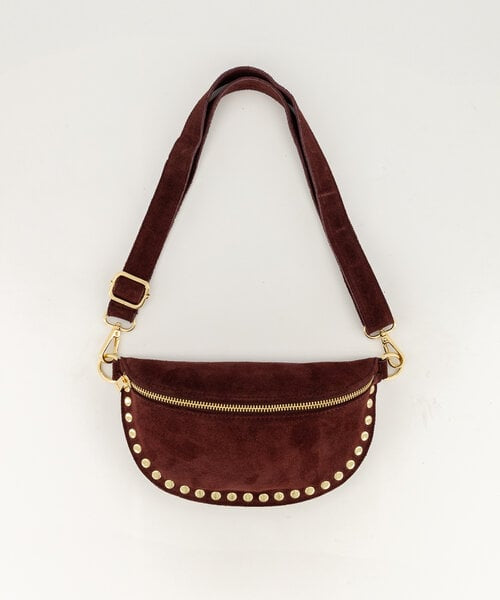 Debby is een suede leren heuptas die ook als crossbody tas gedragen kan worden. De Debby heuptas heeft een binnenvak en een steekvak met een afneembaar en verstelbaar leren hengsel. De tas is afgewerkt met studs en goudkleurig hardware.