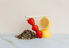 Strawberry Lemon. Groene thee met aardbei, citroengras, frisse appel en zoete bergamot. Verfijnde groene thee met het zuurtje van citroengras, het frisse van appel en het zoete van aardbei en bergamot. Een verrassende combinatie van sterke smaken met een heerlijk aromatische geur.
