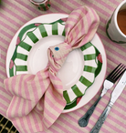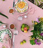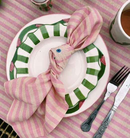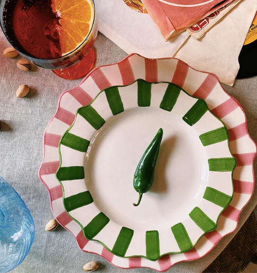 The Green Scalloped Breakfast Plate has a fun-living design that effortlessly illuminates your table setting. The hand-painted adventurous green stripes around the outer circle of the sculpted plates make the item fun and extraordinary. Pair it with the other plates from our SS24 homeware collection and create your colourful and inspiring take on life.