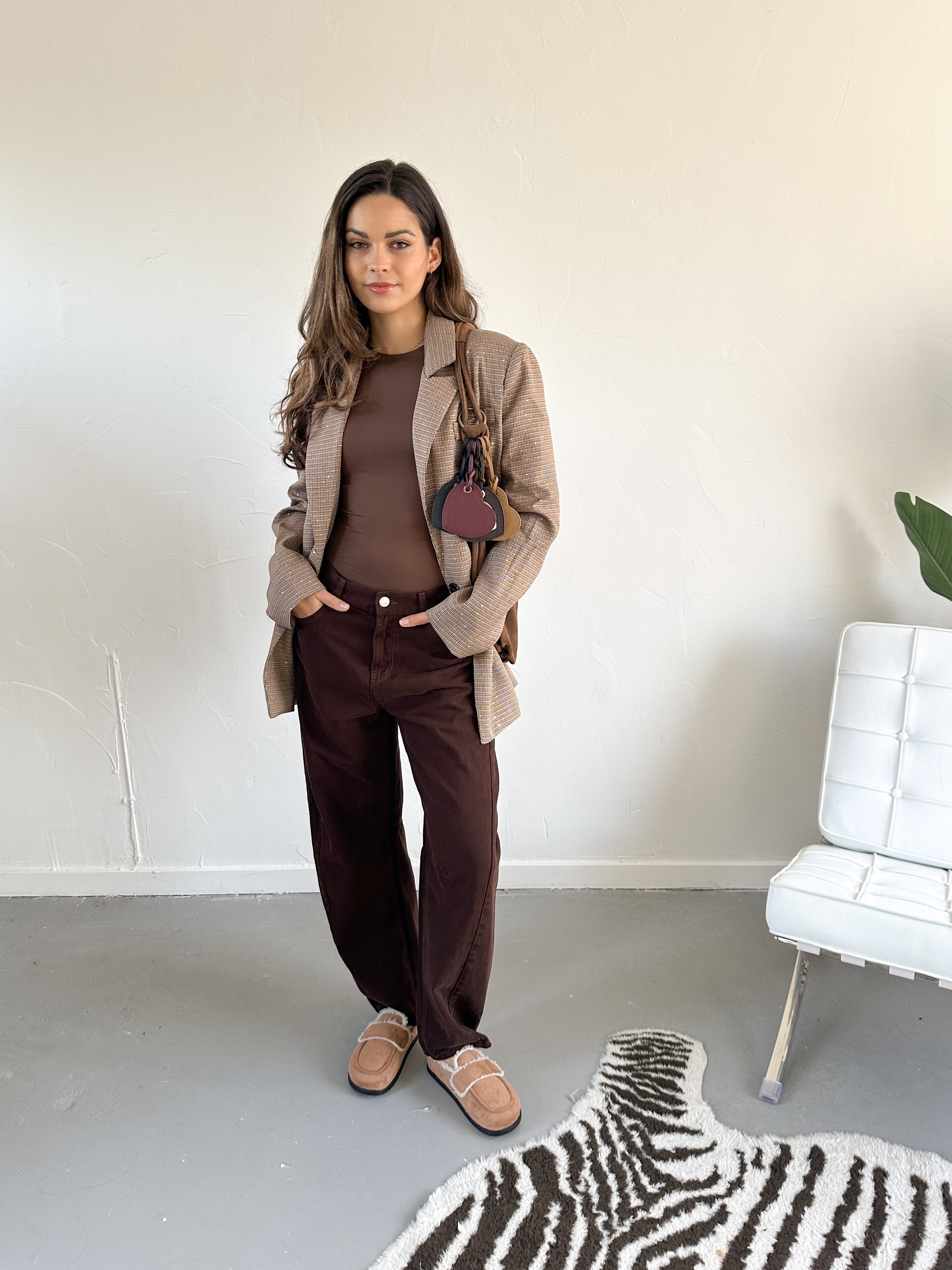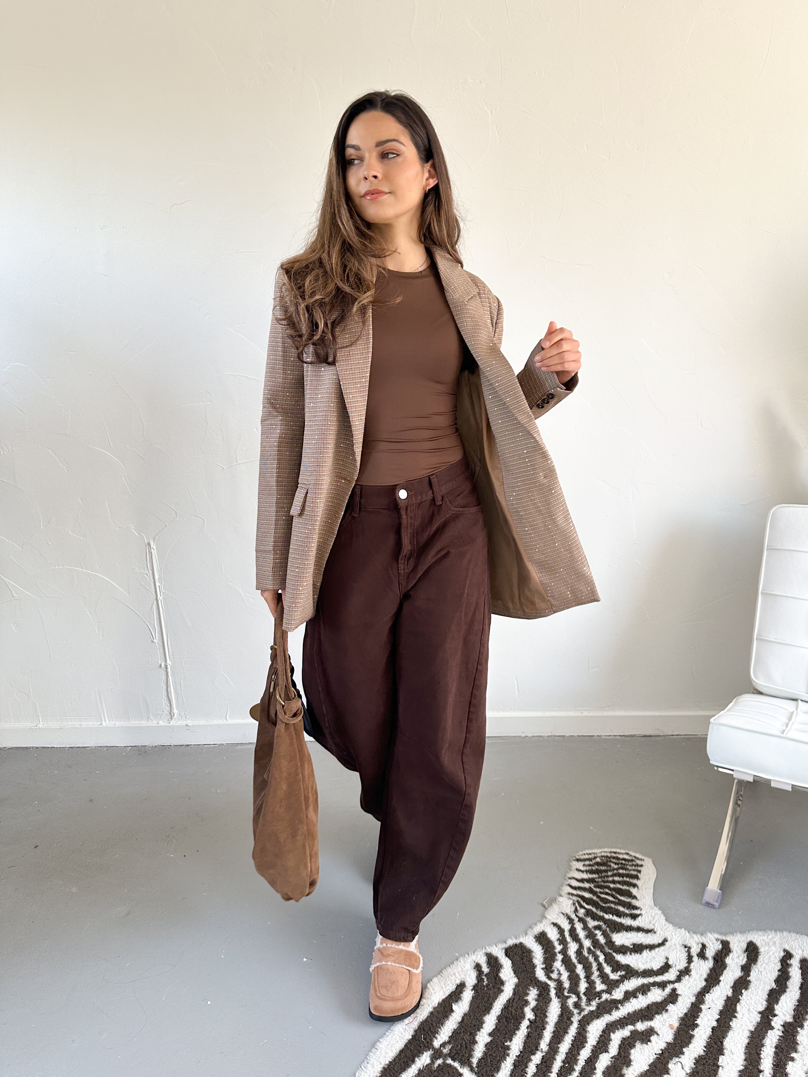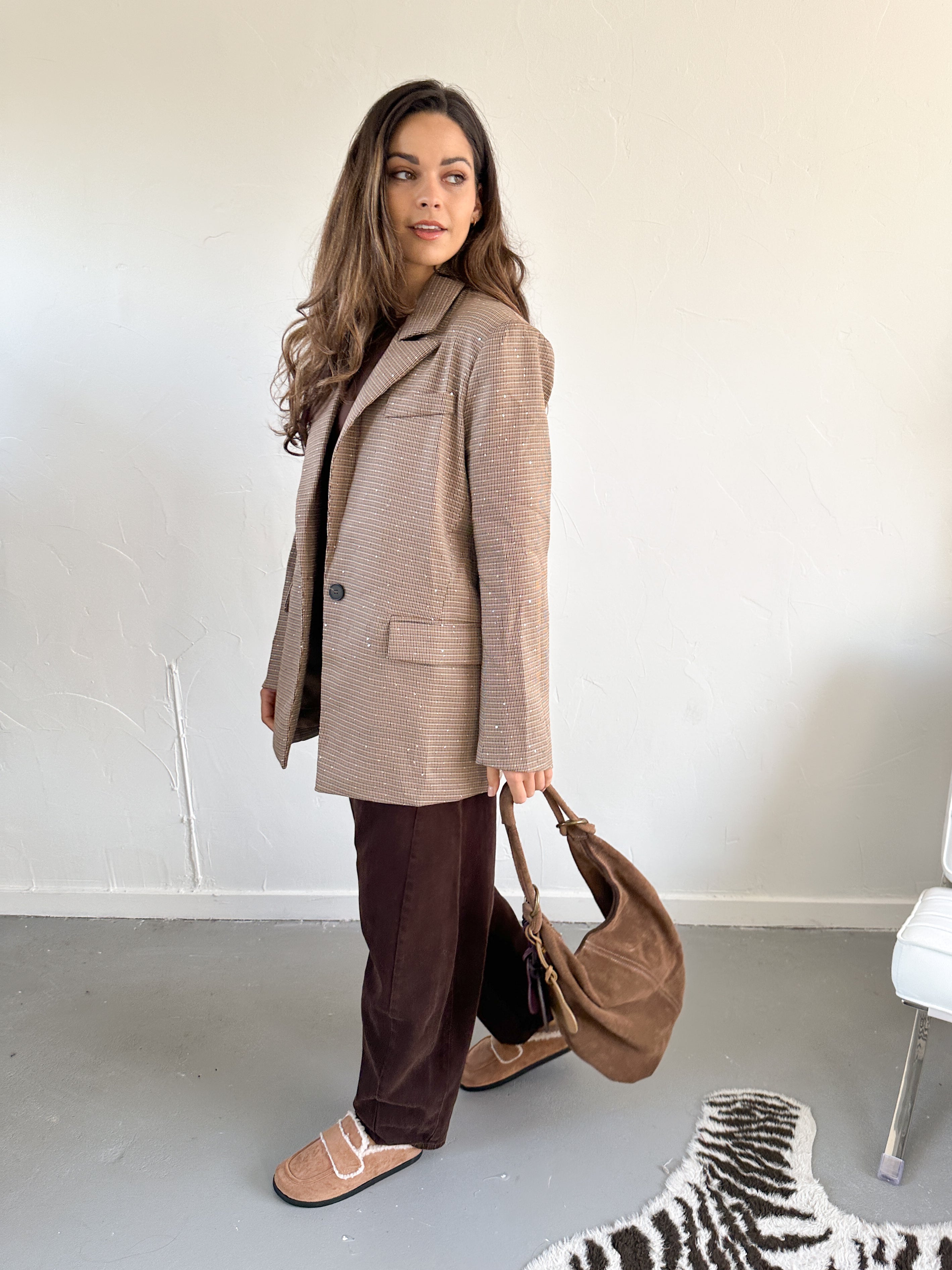 Deze oversized blazer is alles behalve standaard. Het ruitje met steentjes geeft ‘m een verrassende, chique twist, terwijl de oversized fit zorgt voor een relaxte maar stijlvolle uitstraling. Perfect om casual te dragen met jeans of juist chic te combineren met een pantalon of jurk. Met deze blazer maak je gegarandeerd een statement.