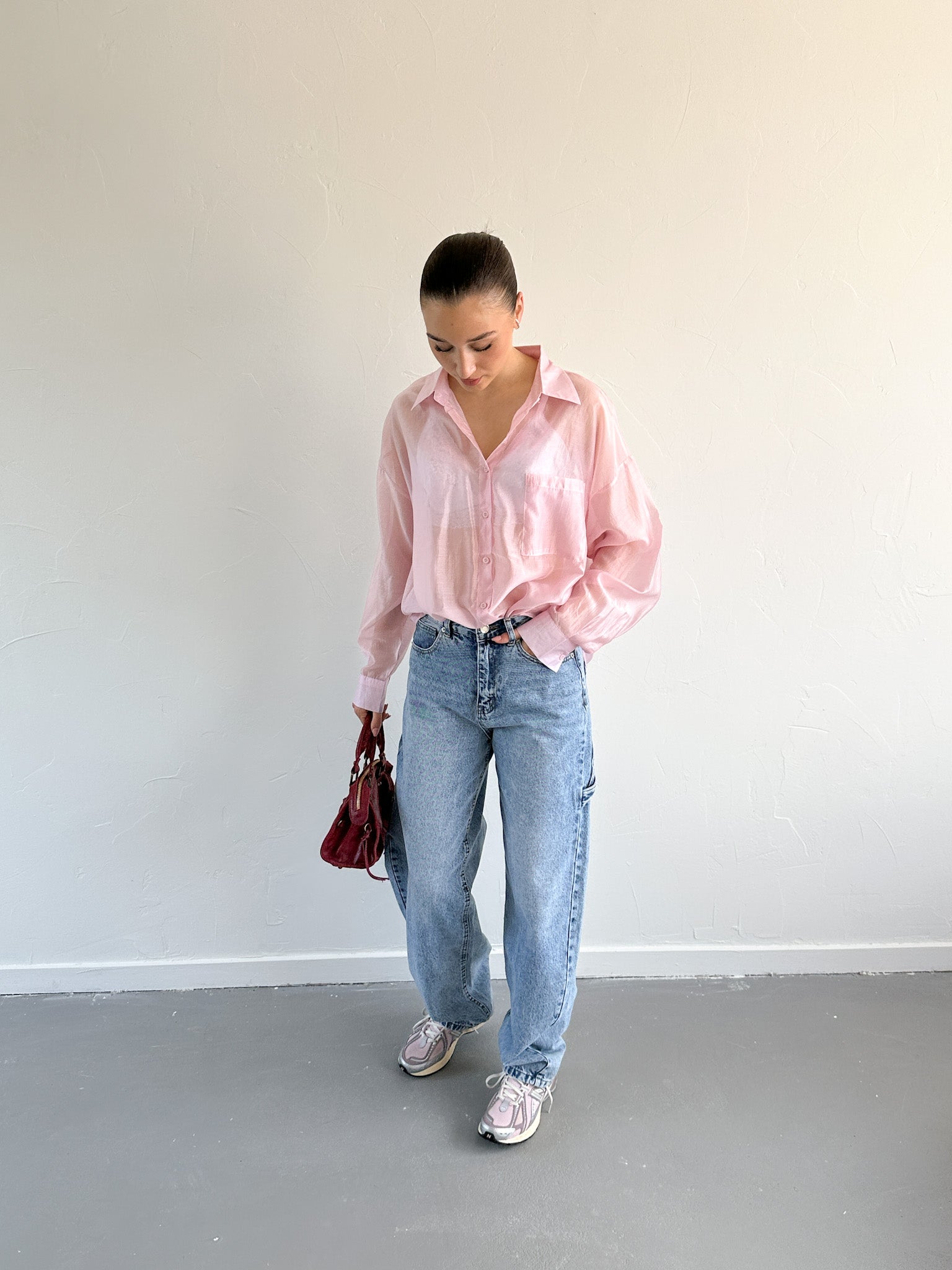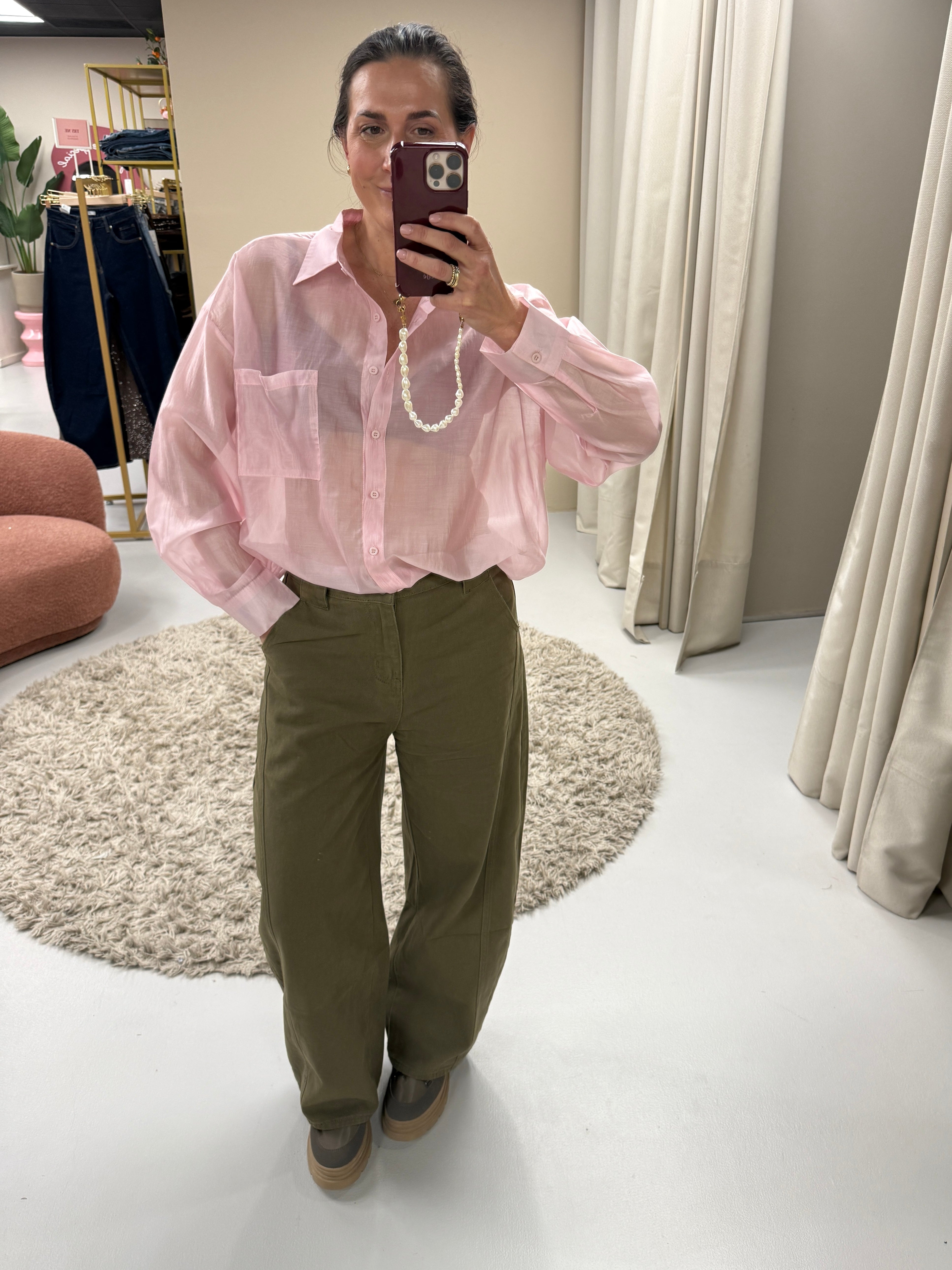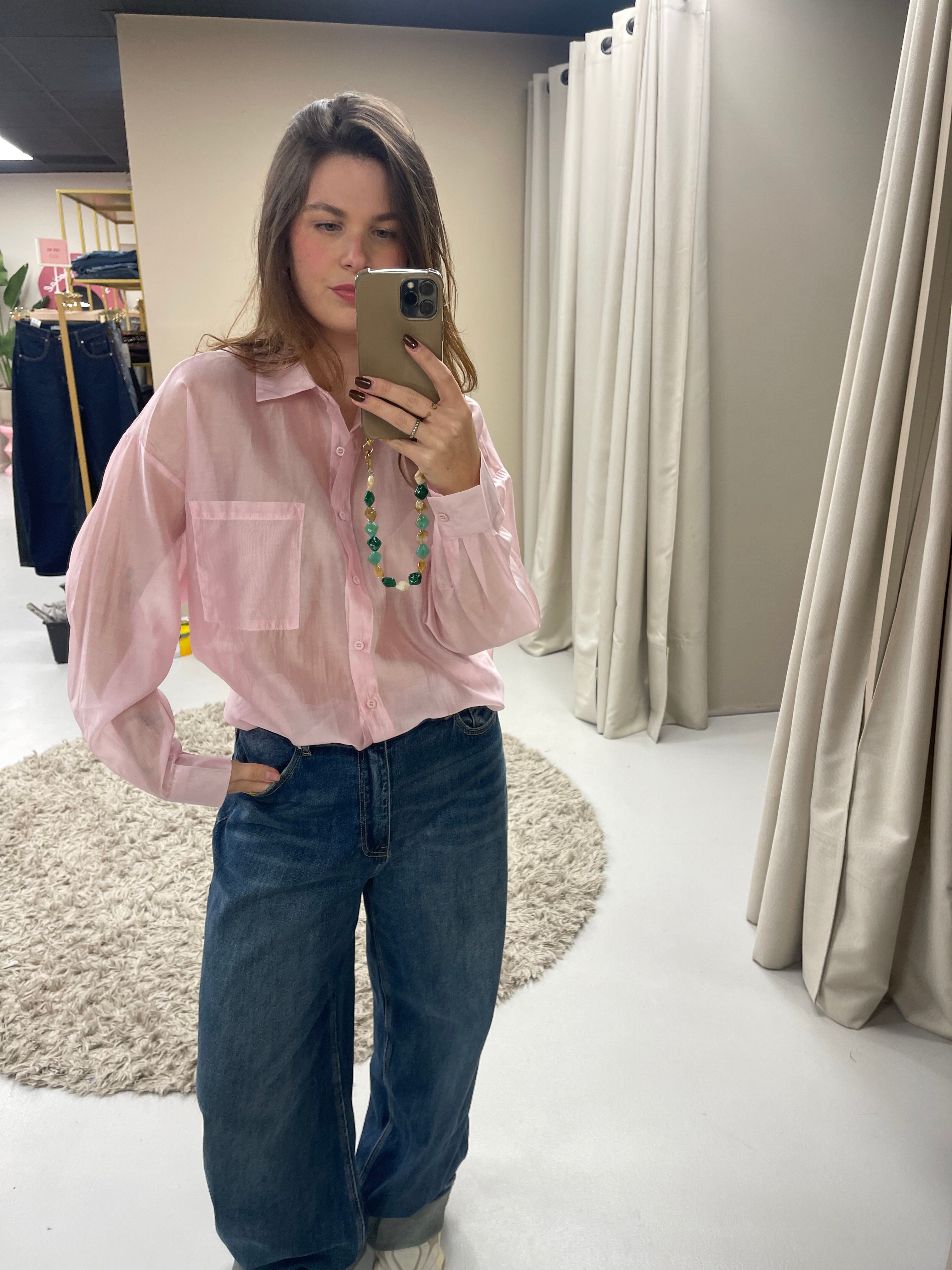 Deze roze blouse is luchtig, elegant en helemaal on-trend. De licht doorlatende stof geeft een subtiele, vrouwelijke touch en maakt ‘m perfect voor zonnige dagen of een avondje uit. Draag ‘m los over een bralette, in je favoriete jeans of geknoopt voor een speelse look.
