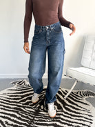Deze balloon fit jeans in klassiek blauw is dé jeans van het moment. Met een high waist en taps toelopende pijpen creëert hij die nonchalante, edgy look waar we van houden. De stevige denim en relaxte fit zorgen voor comfort én stijl — perfect met een basic tee of cropped top.