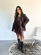 Deze bruinkleurige jurk met schuine lijn is een echte must-have. De zachte stof en speelse pasvorm maken ‘m niet alleen perfect om solo te dragen, maar ook superleuk om onder je bovenstuk uit te laten komen – dé layering trend van dit moment. Of je ‘m nu styled met een blazer, knit of oversized shirt: deze jurk geeft je outfit net dat beetje extra.