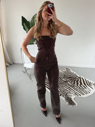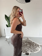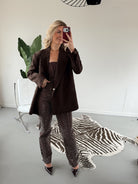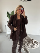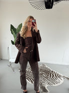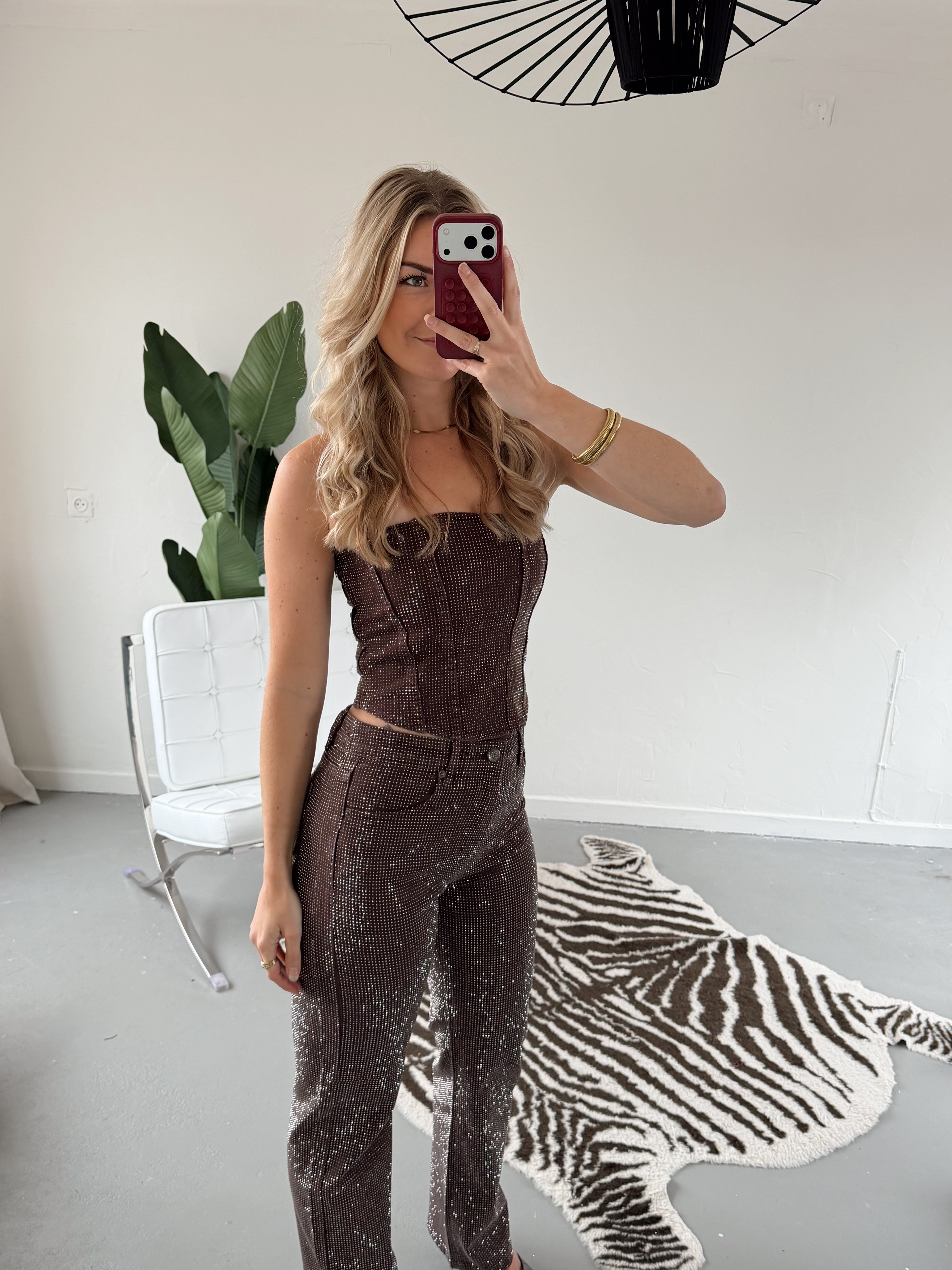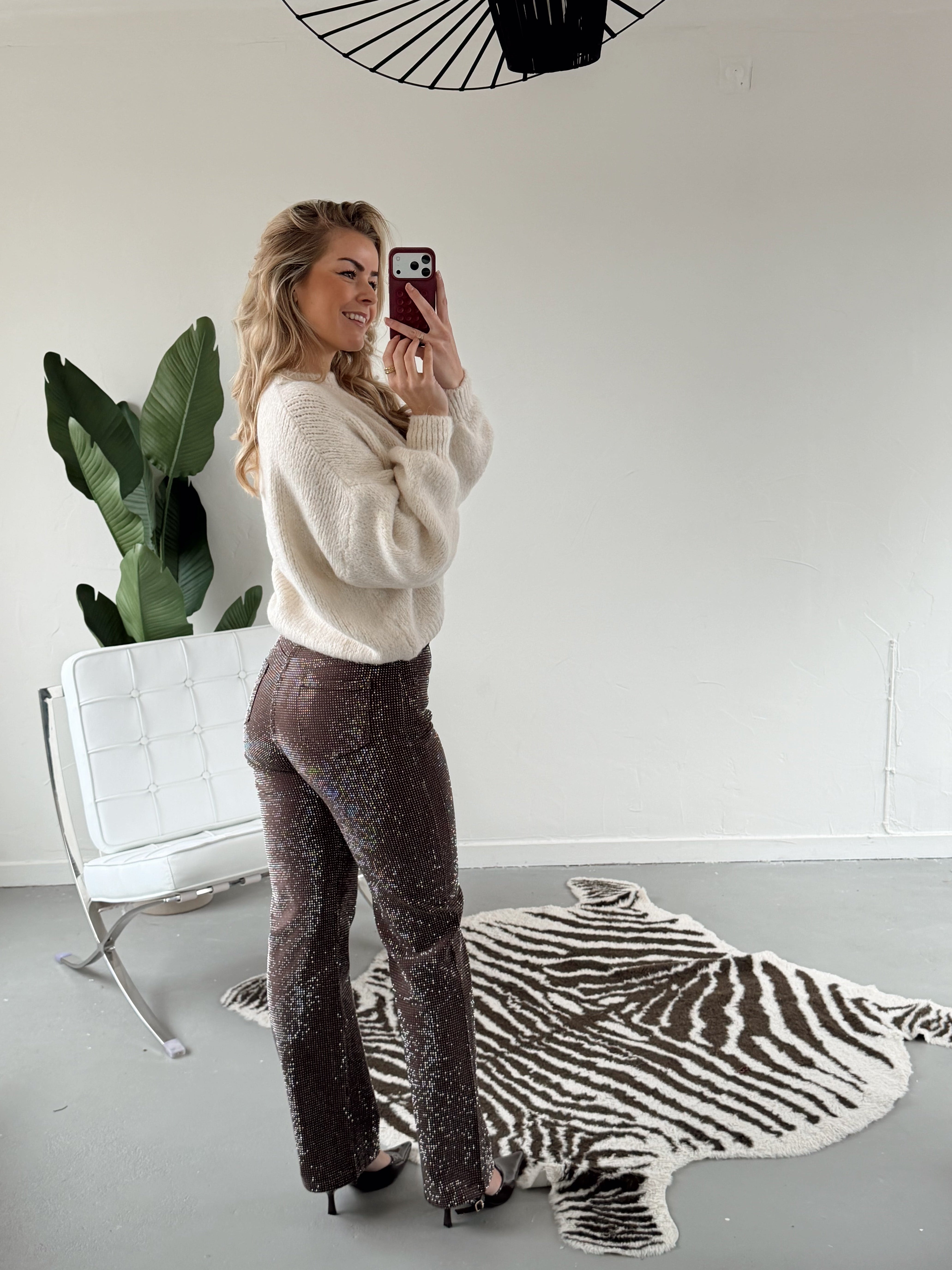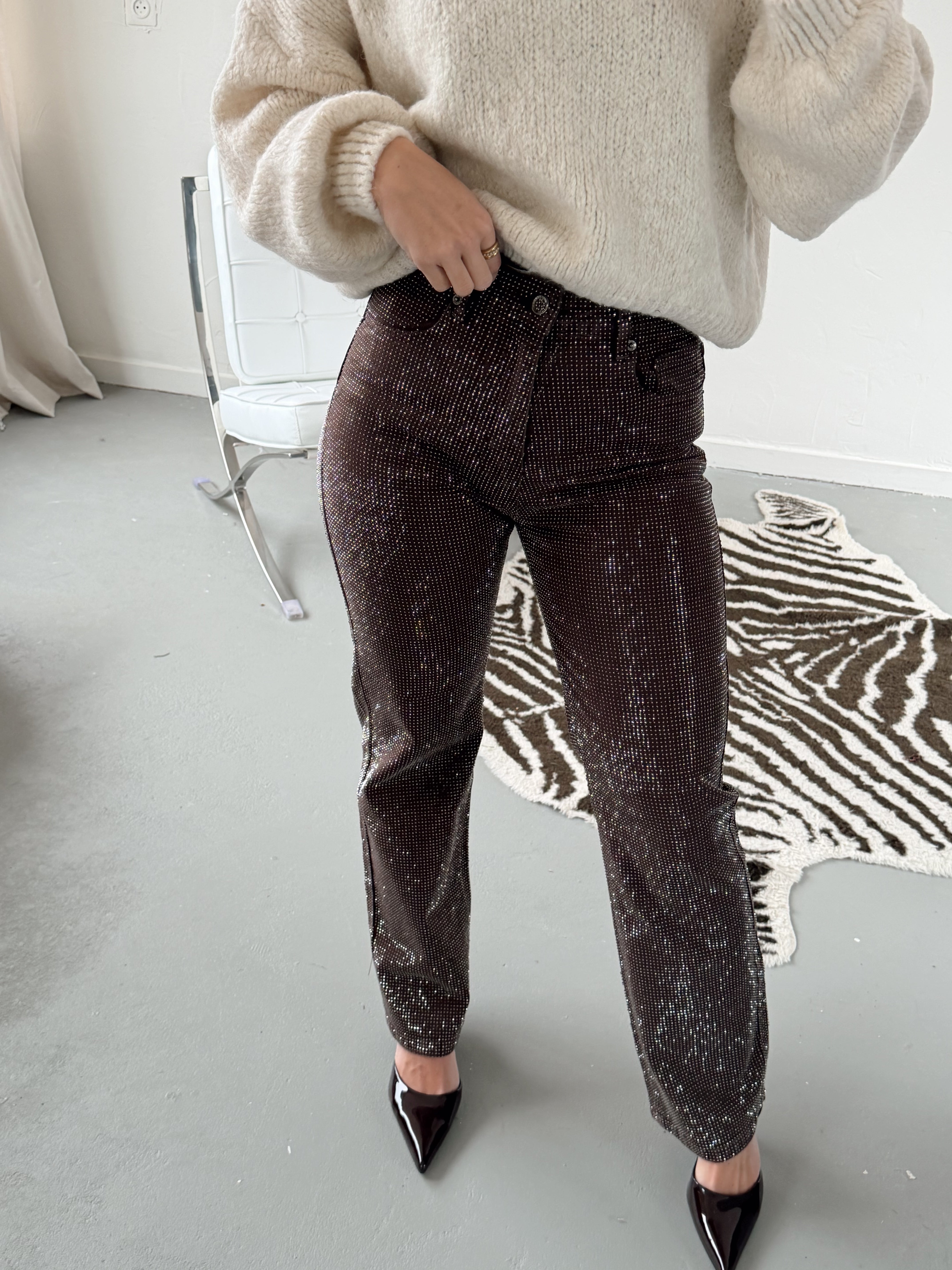 Deze bruine glitter broek is perfect voor iedereen die houdt van een beetje sparkle. De zachte stretchstof zit heerlijk, terwijl de glitterafwerking zorgt voor een feestelijke, stijlvolle look. Combineer βm met de bijpassende glitter top voor een complete, on-trend set β ready to shine! β¨π€