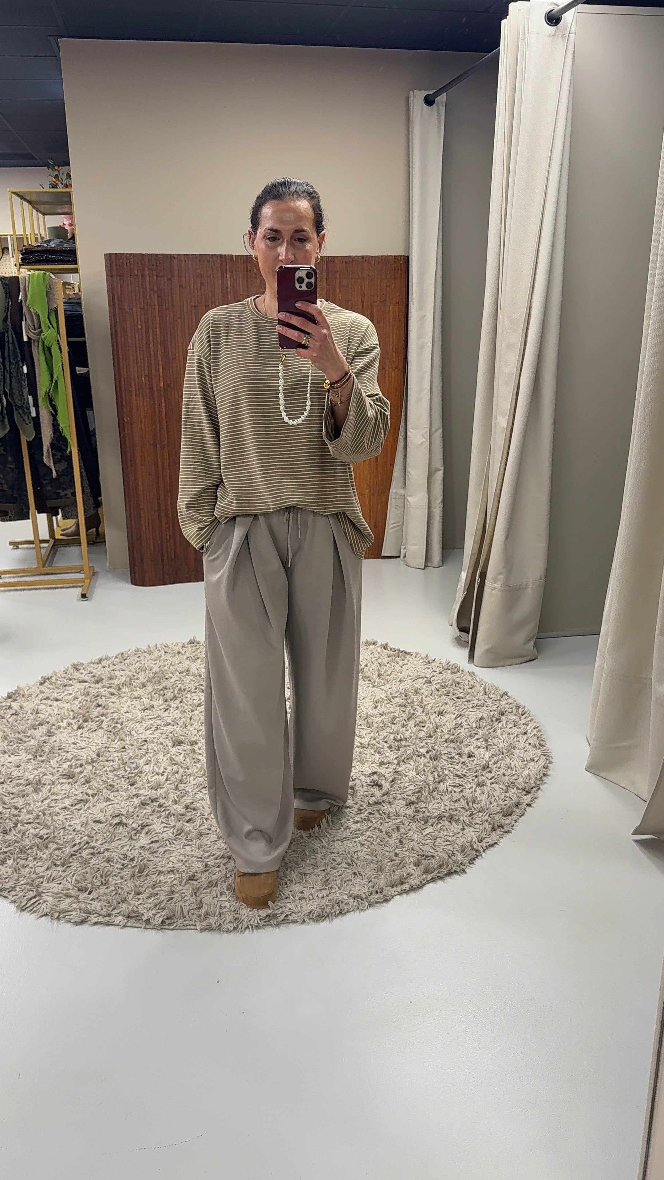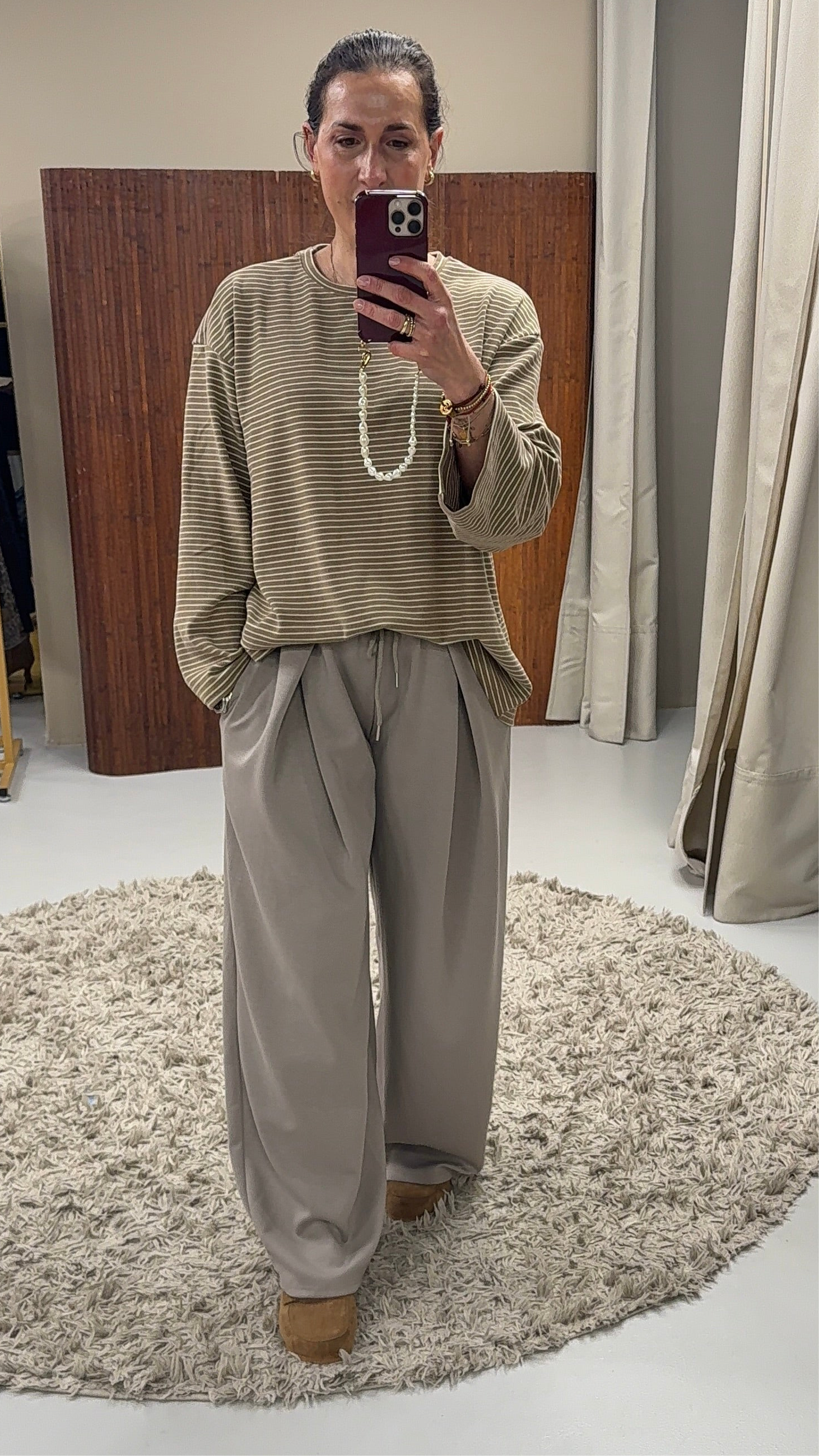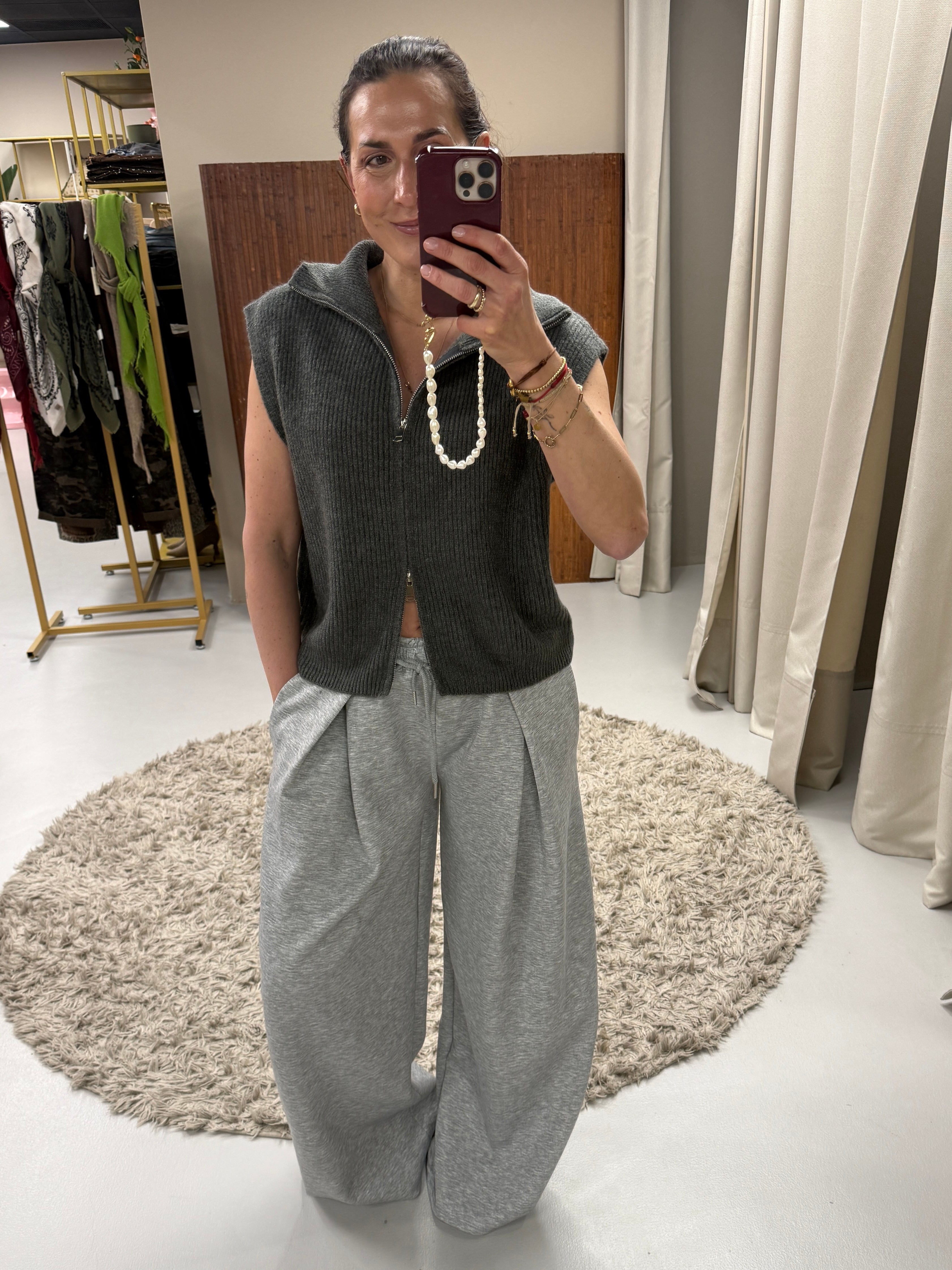 Het model is 174cm en draagt maat onesize. Te dragen tot maat 40 en lengte 178