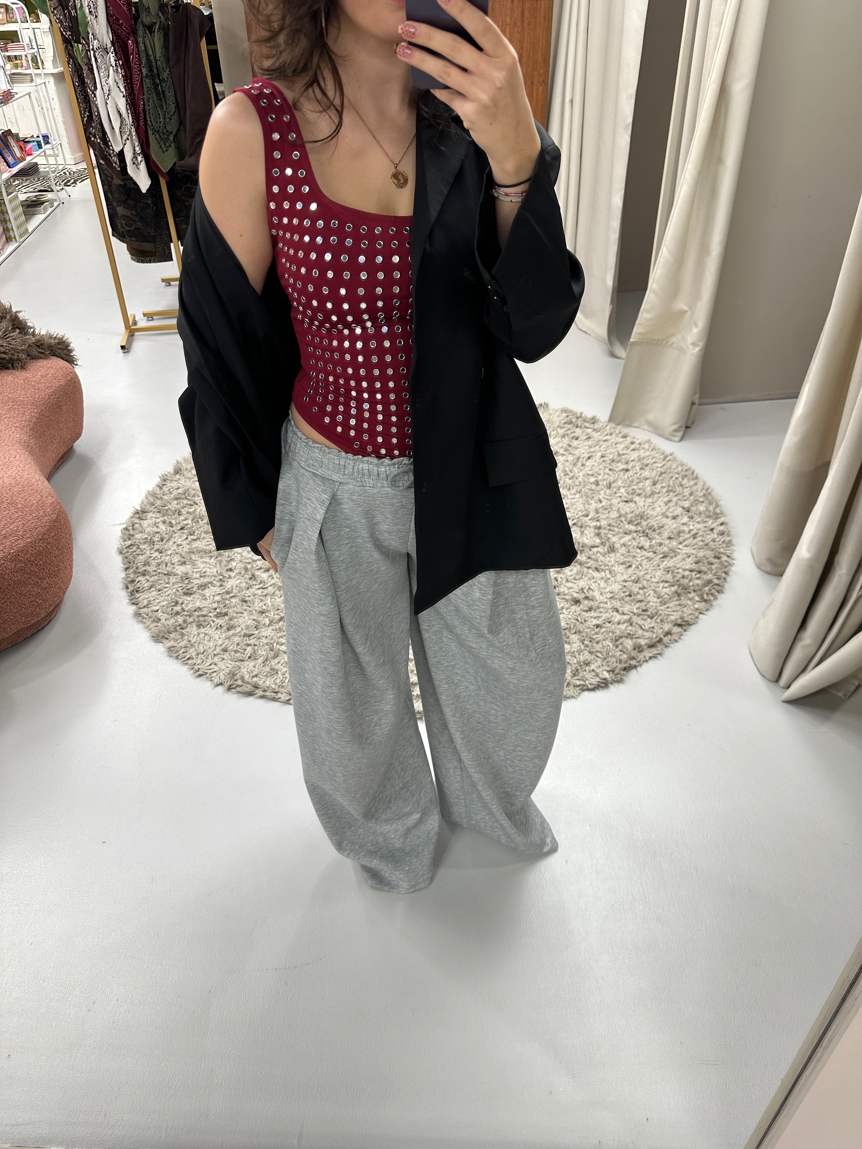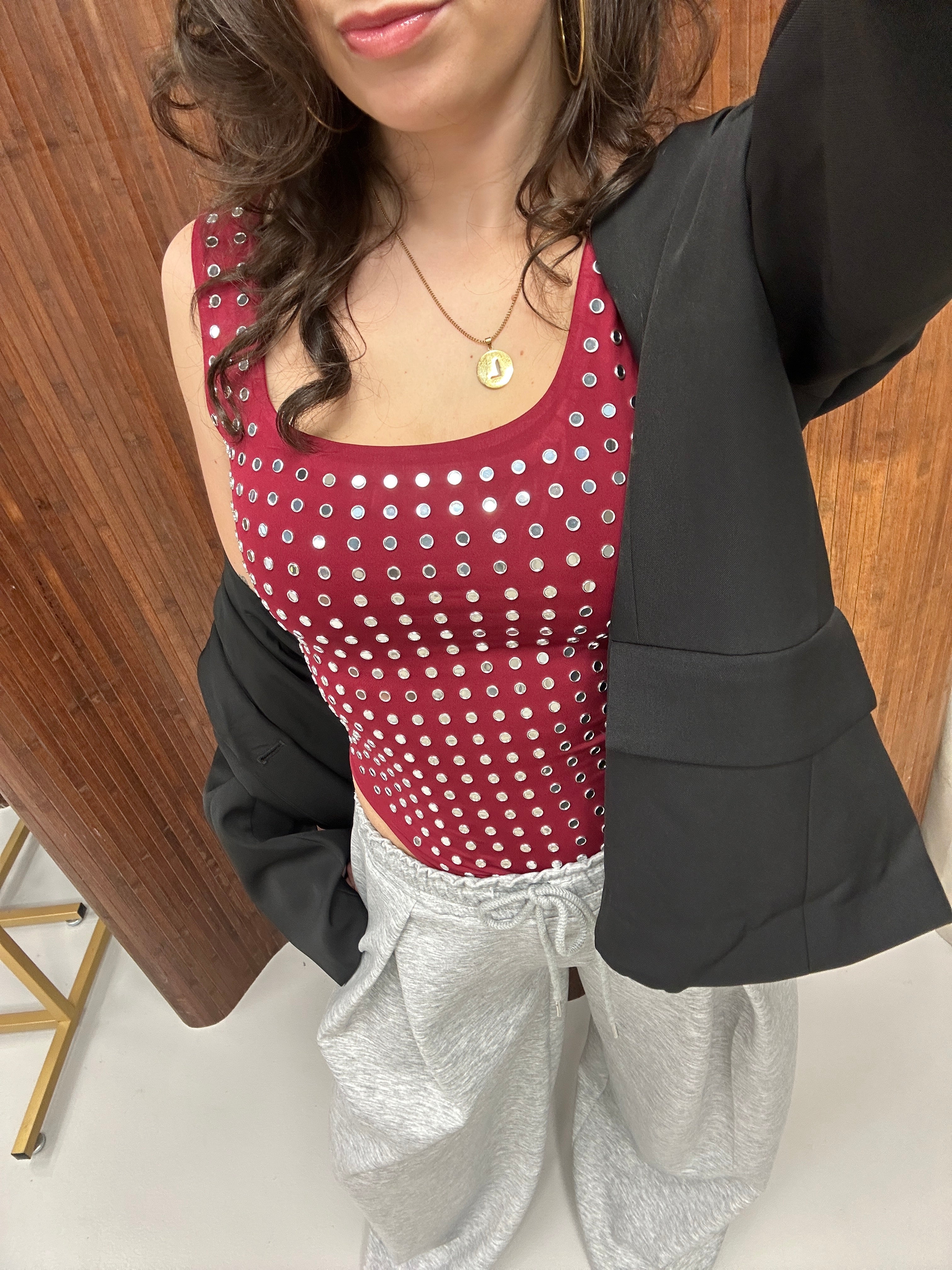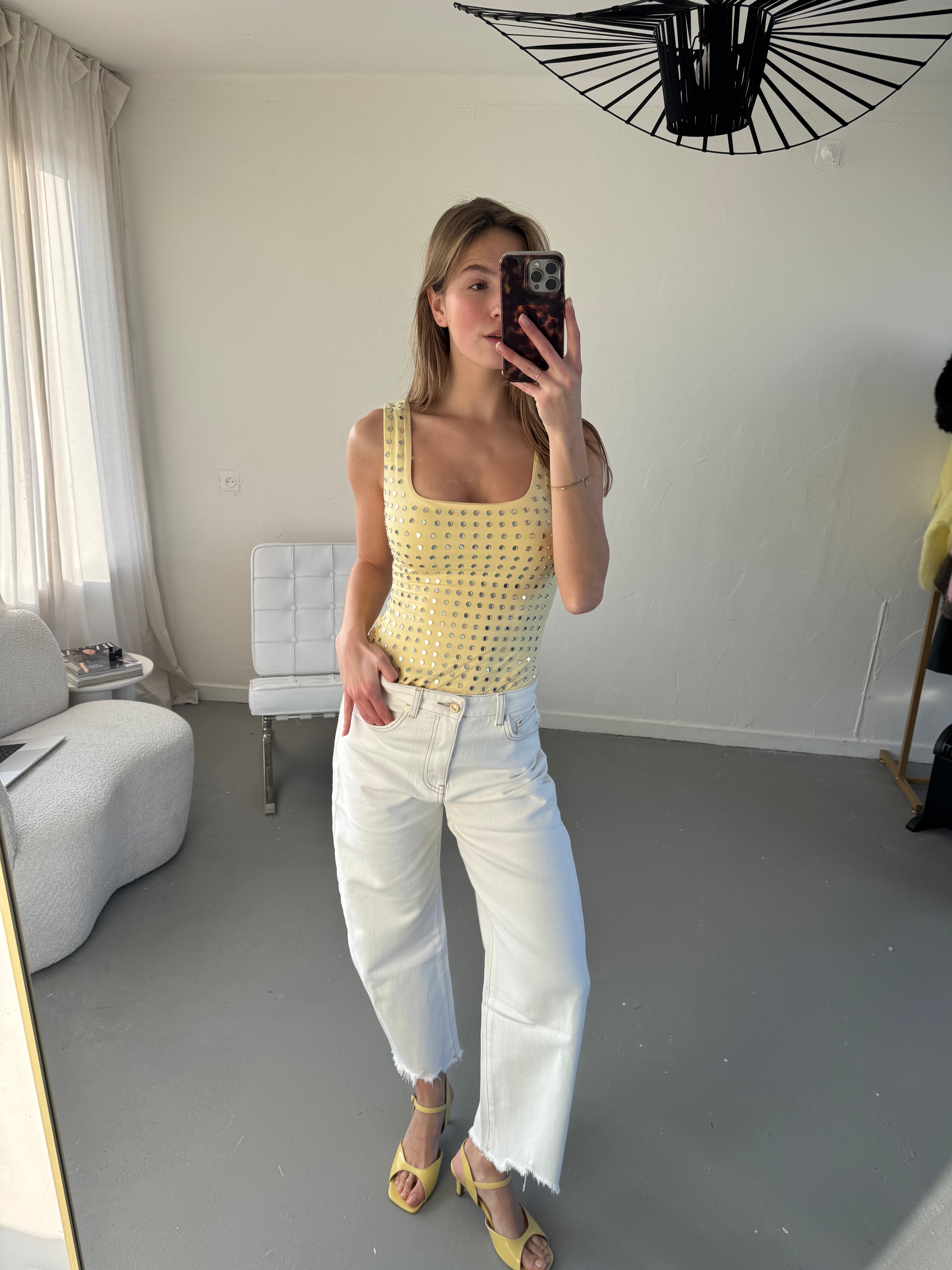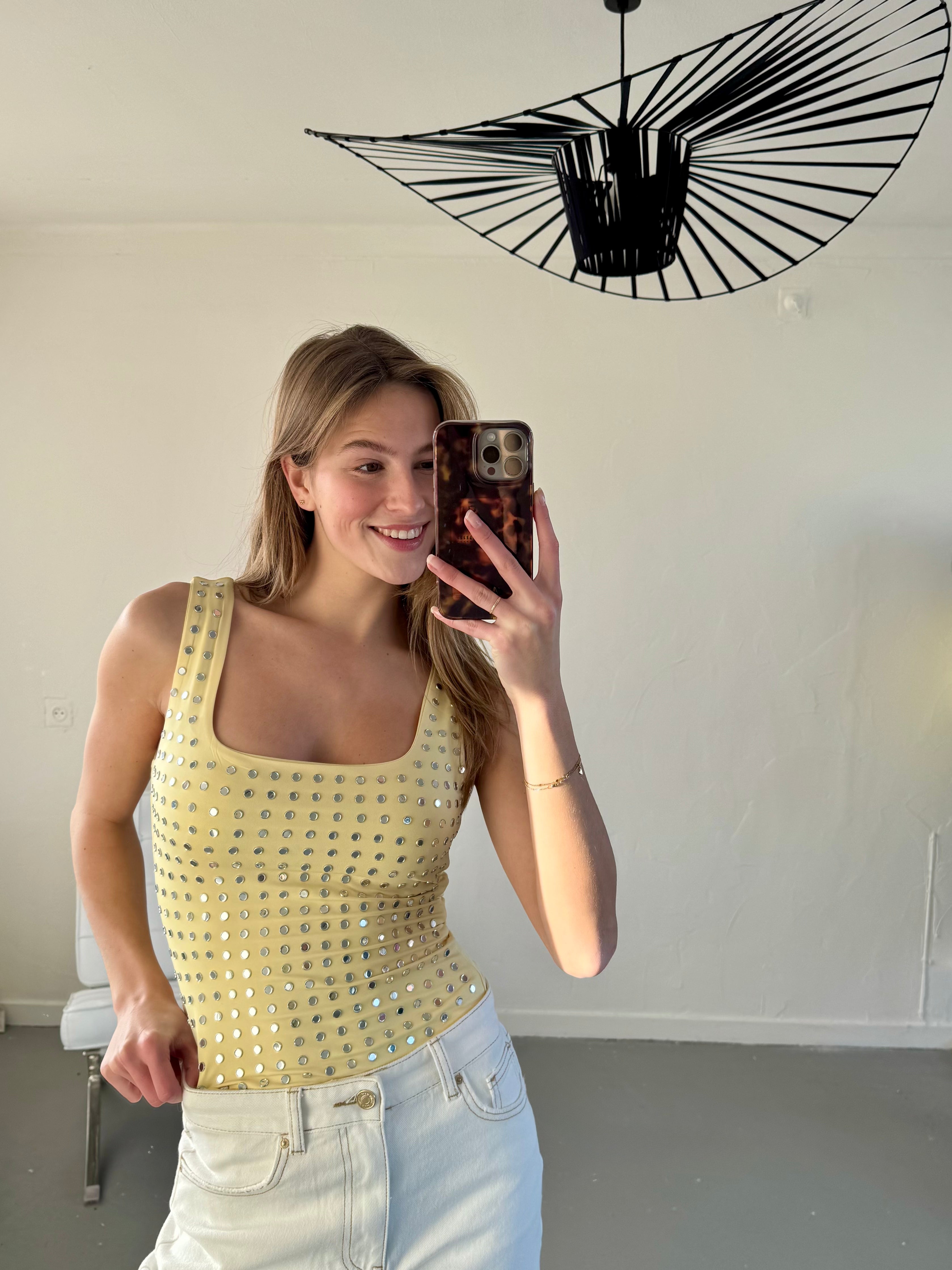 De Mirror Body is uitgevoerd in een zachte, stretchy stof en afgewerkt met subtiele spiegelende studs die zorgen voor nét dat beetje extra. De rechte halslijn en brede bandjes geven een vrouwelijke, krachtige look, terwijl de body mooi aansluit op het lichaam.