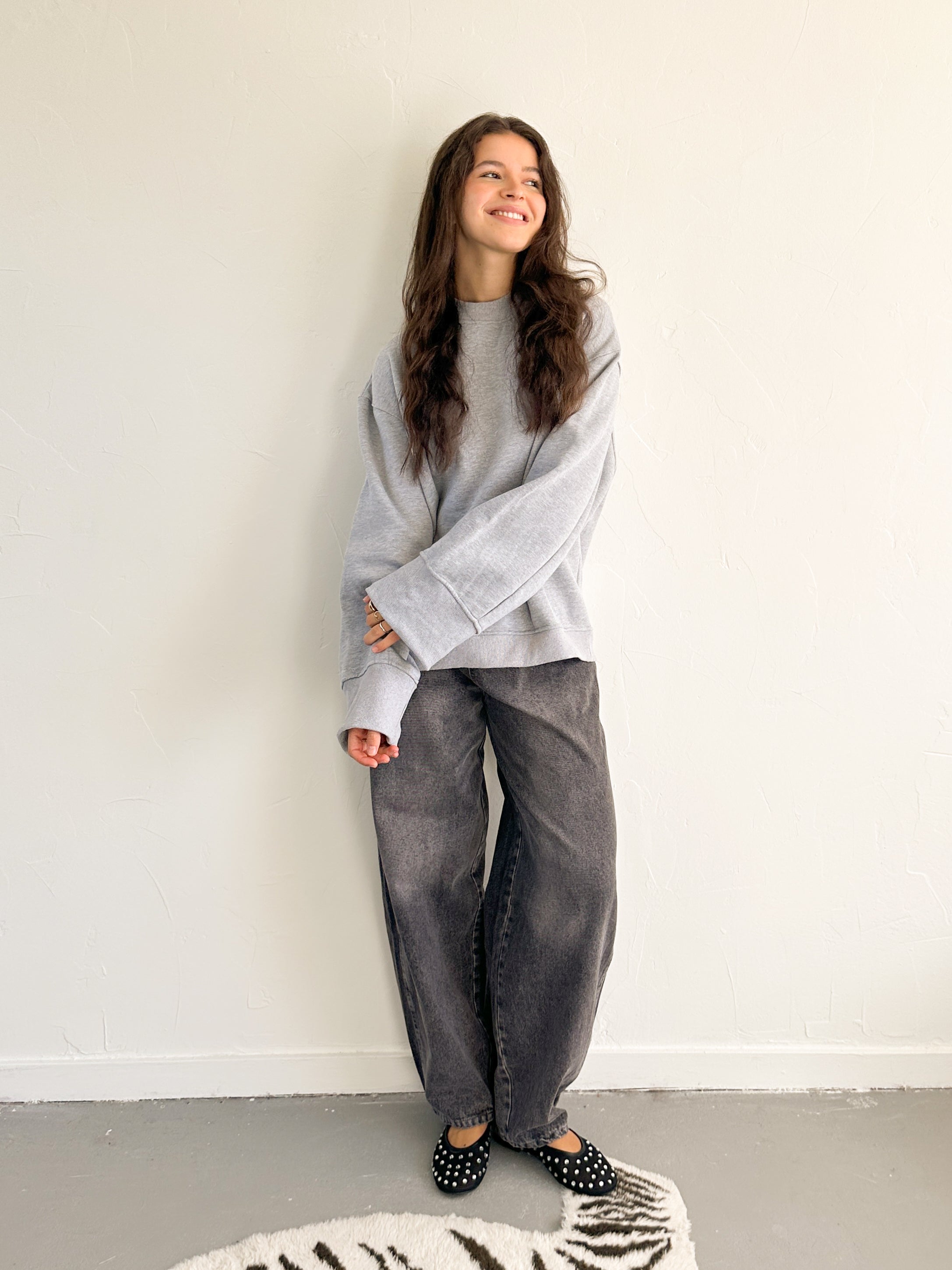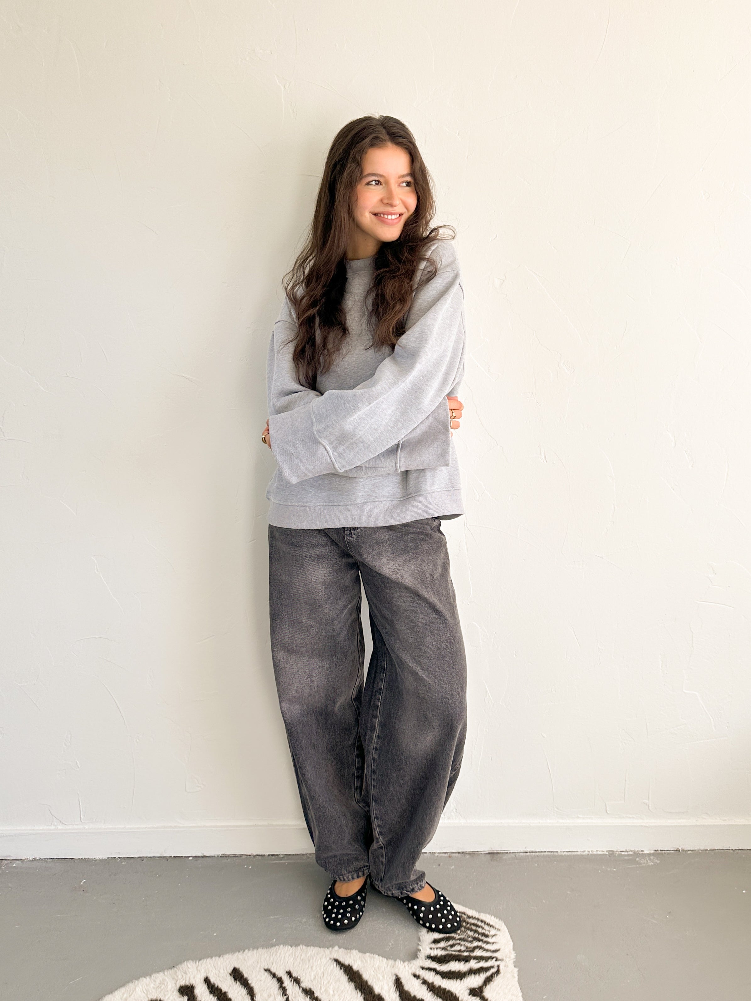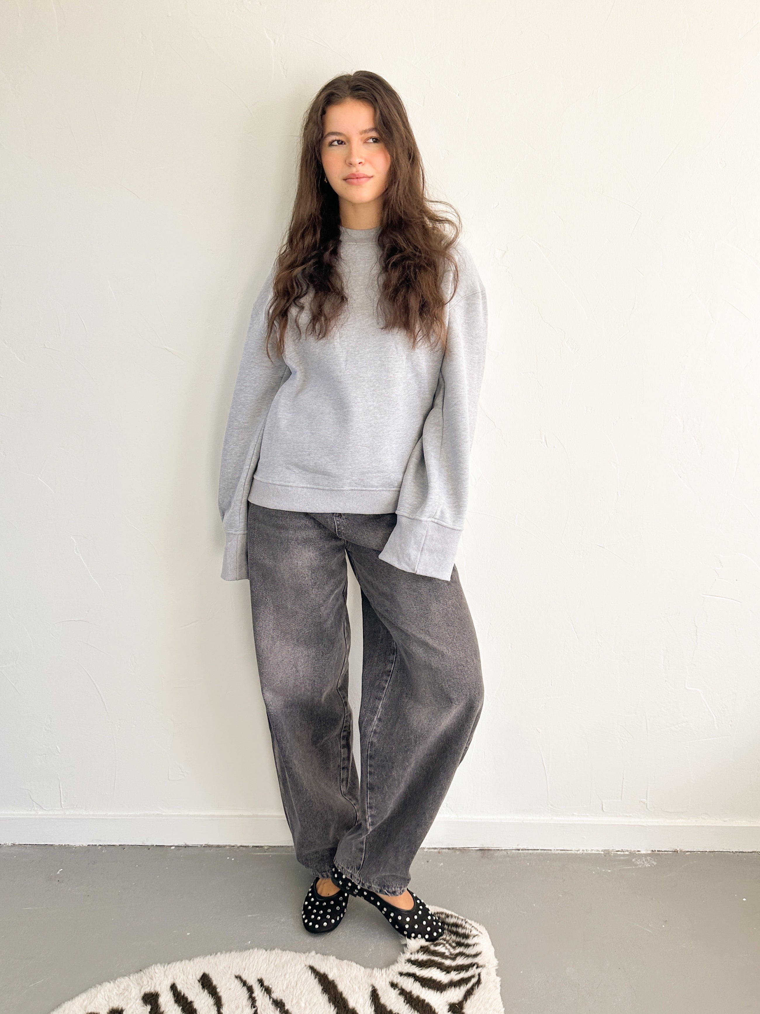 Deze grijze sweater geeft de basic trui een fashionable upgrade. De wijd uitlopende mouwen zorgen voor een opvallend detail, terwijl de zachte stof en relaxte fit ‘m super comfy maken. Perfect om casual te dragen met jeans of te stylen met een pantalon of rok voor een edgy touch.