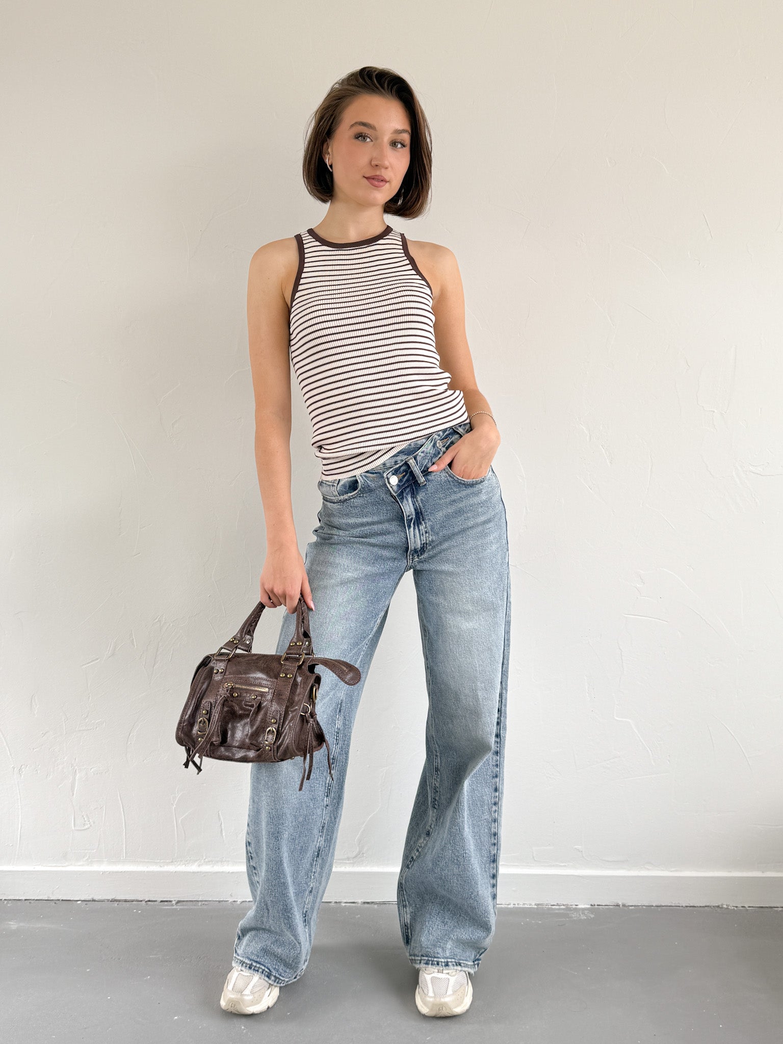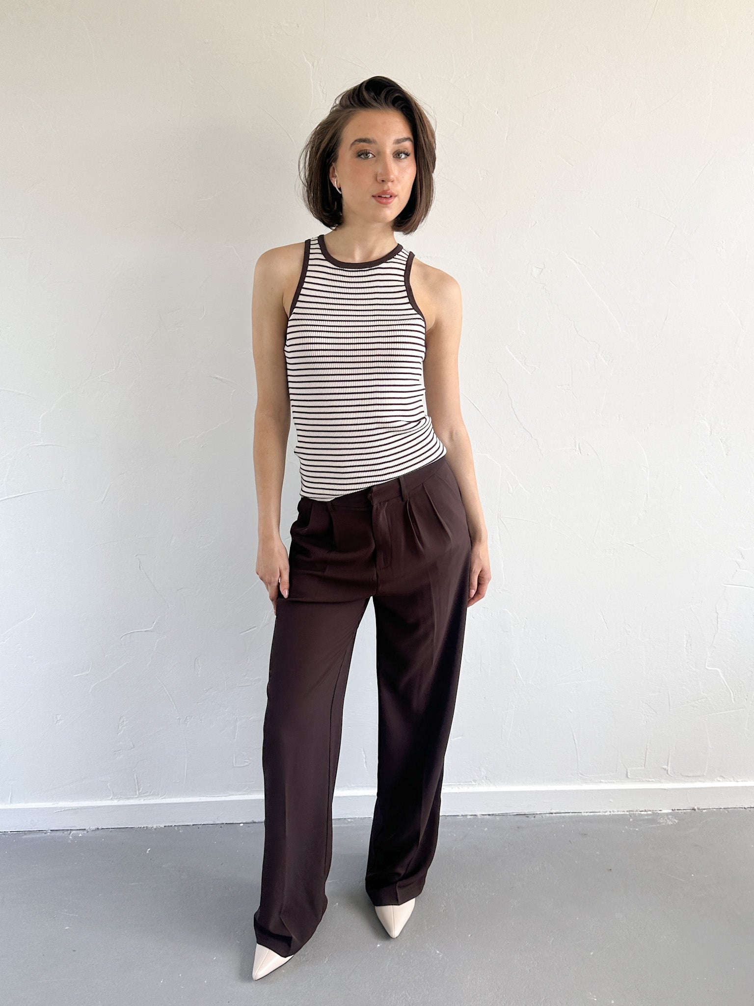 Deze gestreepte tanktop in trendkleur choco is helemaal on point. De combinatie van de warme bruine tint en het speelse streepje maakt 'm perfect voor elke dag. De zachte ribstof sluit mooi aan en is super comfy. Draag ‘m casual op denim of gestyled als setje – altijd goed!