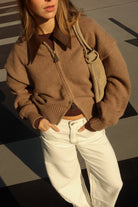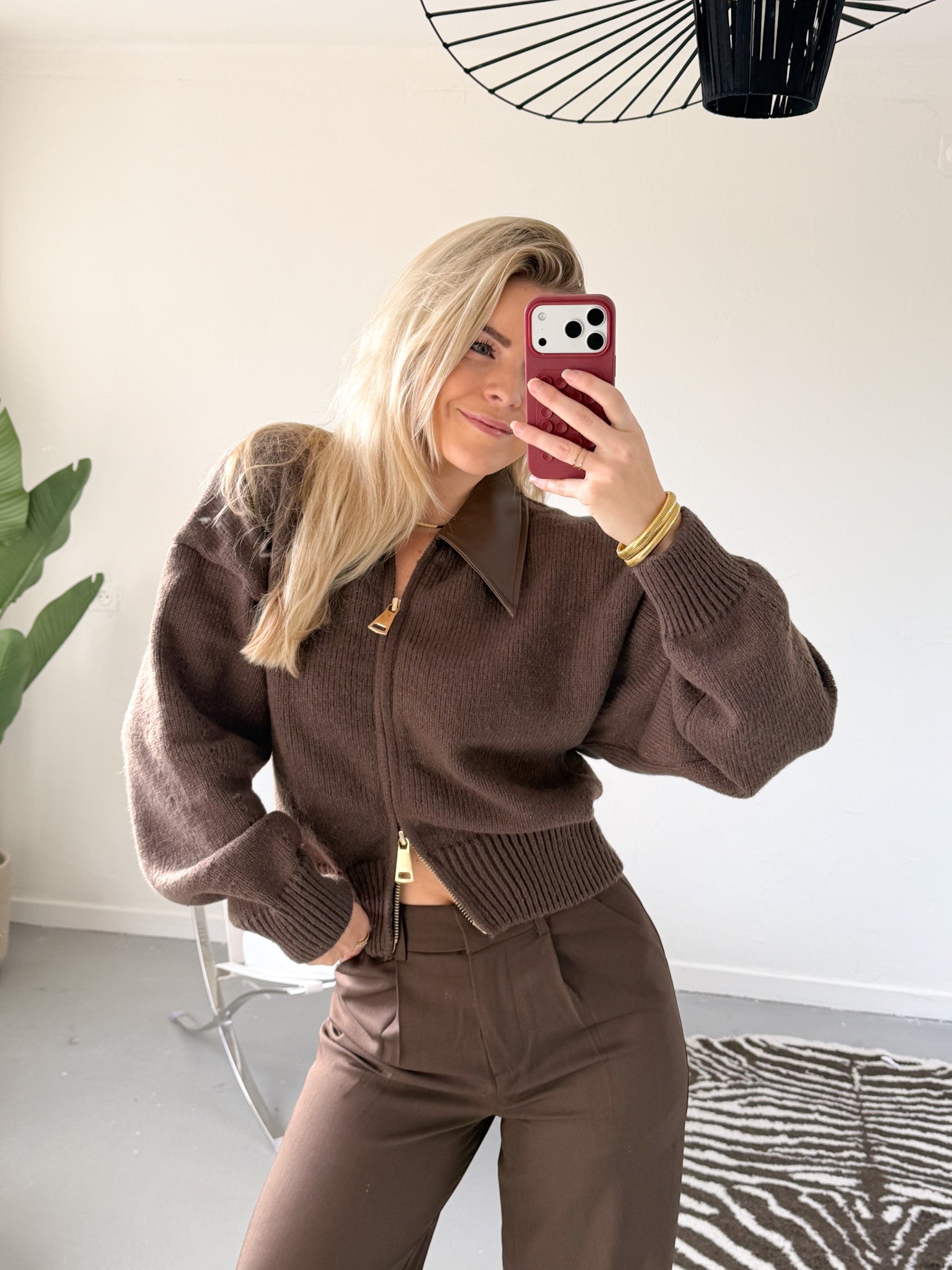 Deze zipper trui is de perfecte mix van comfy en trendy. De rits is aan beide kanten te openen β helemaal de trend van nu! De choco bruine kleur en het leren kraagje geven de trui een stoere, luxe uitstraling. Draag βm casual met jeans of style βm met een pantalon voor een fashionable everyday look. π€β¨