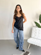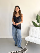 Deze zwarte kanten top met schuine lijn is een echte must-have. De zachte stof en speelse pasvorm maken ‘m niet alleen perfect om solo te dragen, maar ook superleuk om onder je bovenstuk uit te laten komen – dé layering trend van dit moment. Of je ‘m nu styled met een blazer, knit of oversized shirt: deze top geeft je outfit net dat beetje extra.
