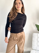 Elegante zwarte top met een subtiele watervalhals en lange mouwen. De aangesloten pasvorm accentueert de vrouwelijke vormen, terwijl de zachte stretchstof zorgt voor comfort en bewegingsvrijheid. Een tijdloos item dat zowel casual als chic te stylen is – ideaal voor op kantoor of een avondje uit.
