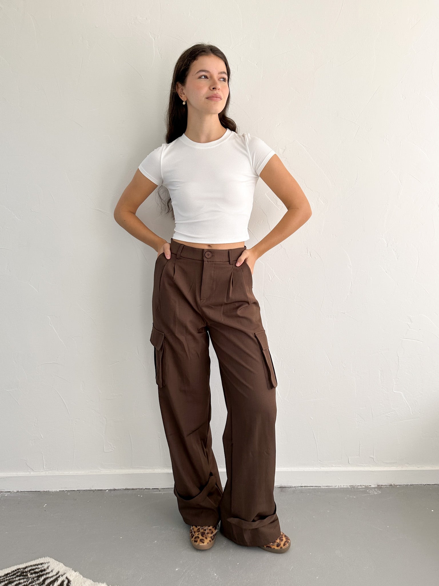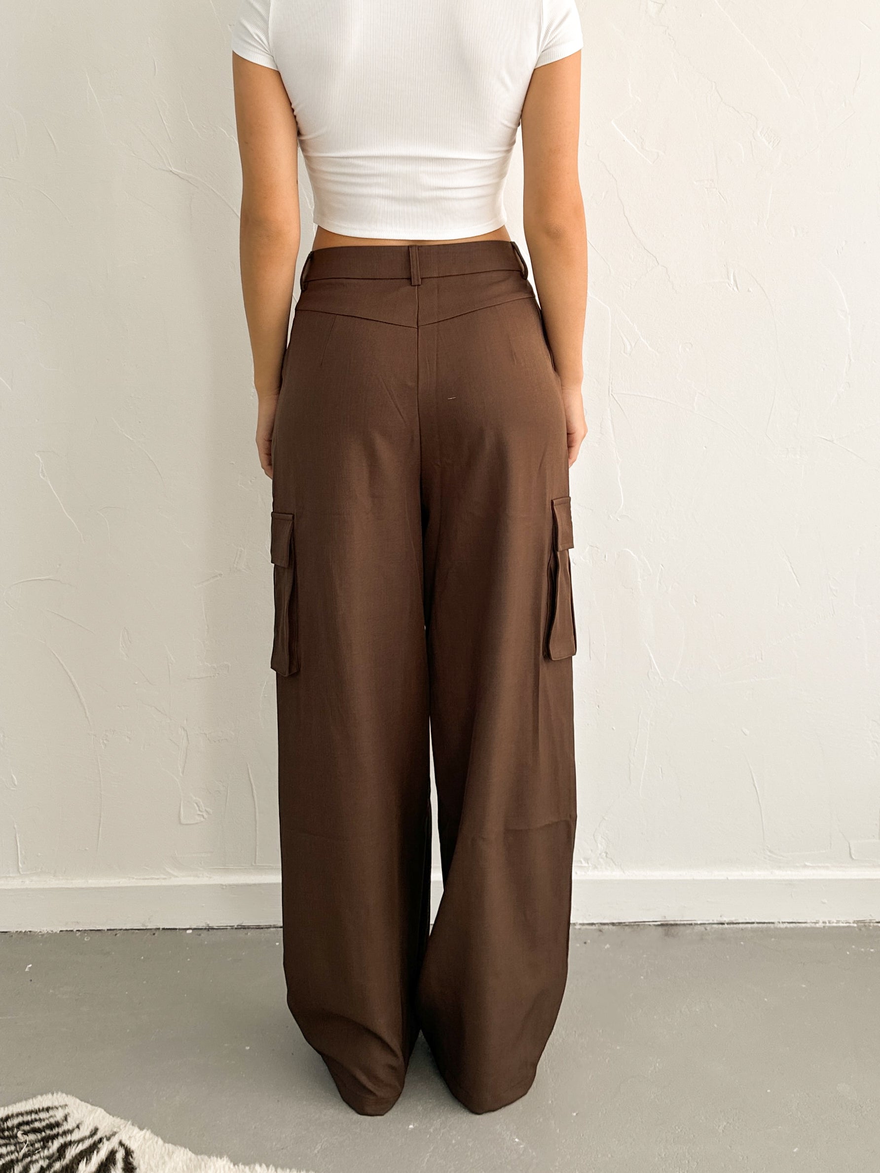 Deze bruine pantalon met zakken is een echte must-have voor je garderobe. De hoge taille en rechte pijpen zorgen voor een tijdloze, elegante look, terwijl de zakken een relaxte en moderne touch geven. Perfect voor kantoor, een etentje of een casual chic outfit met sneakers – deze broek kan altijd.