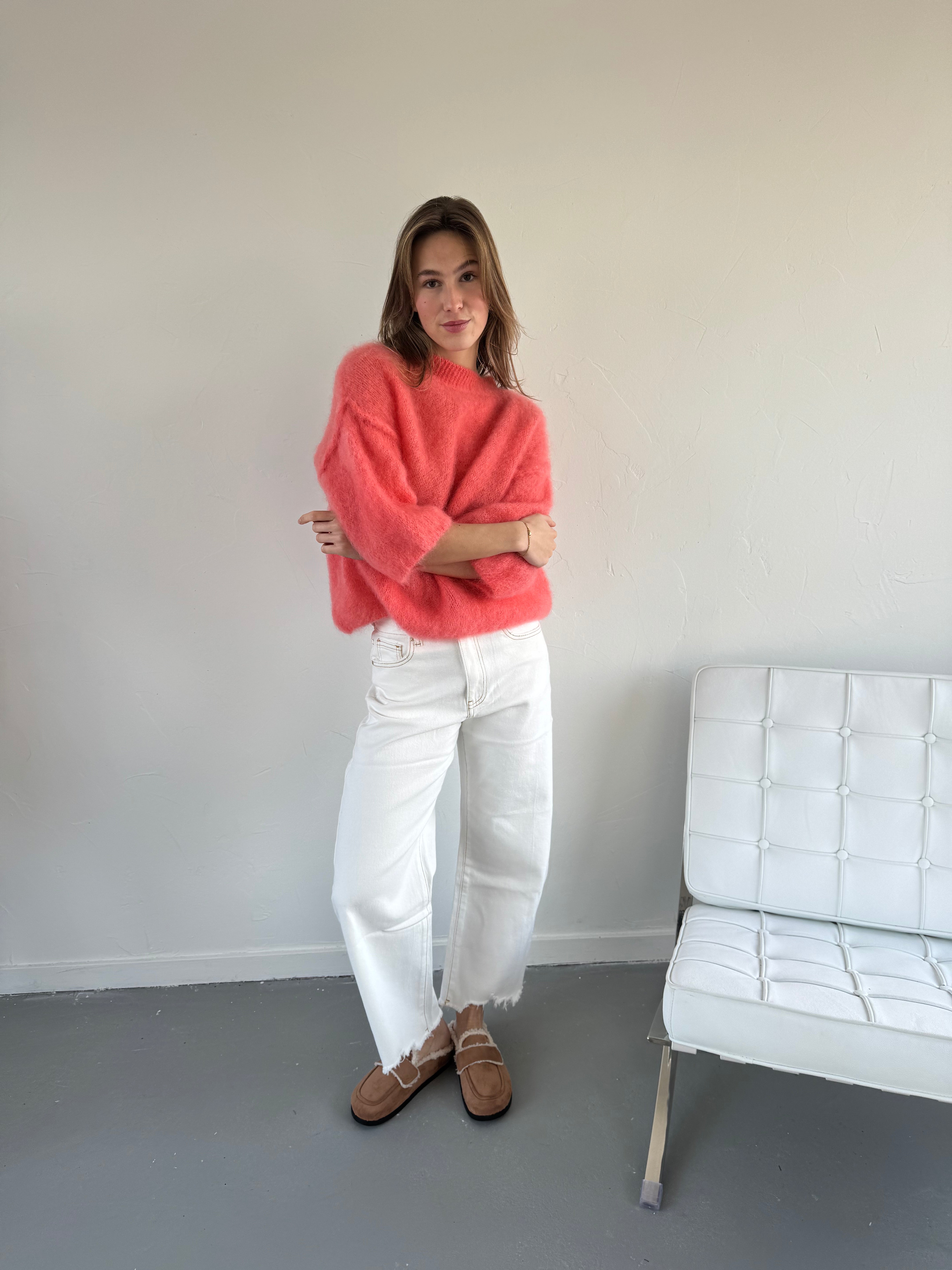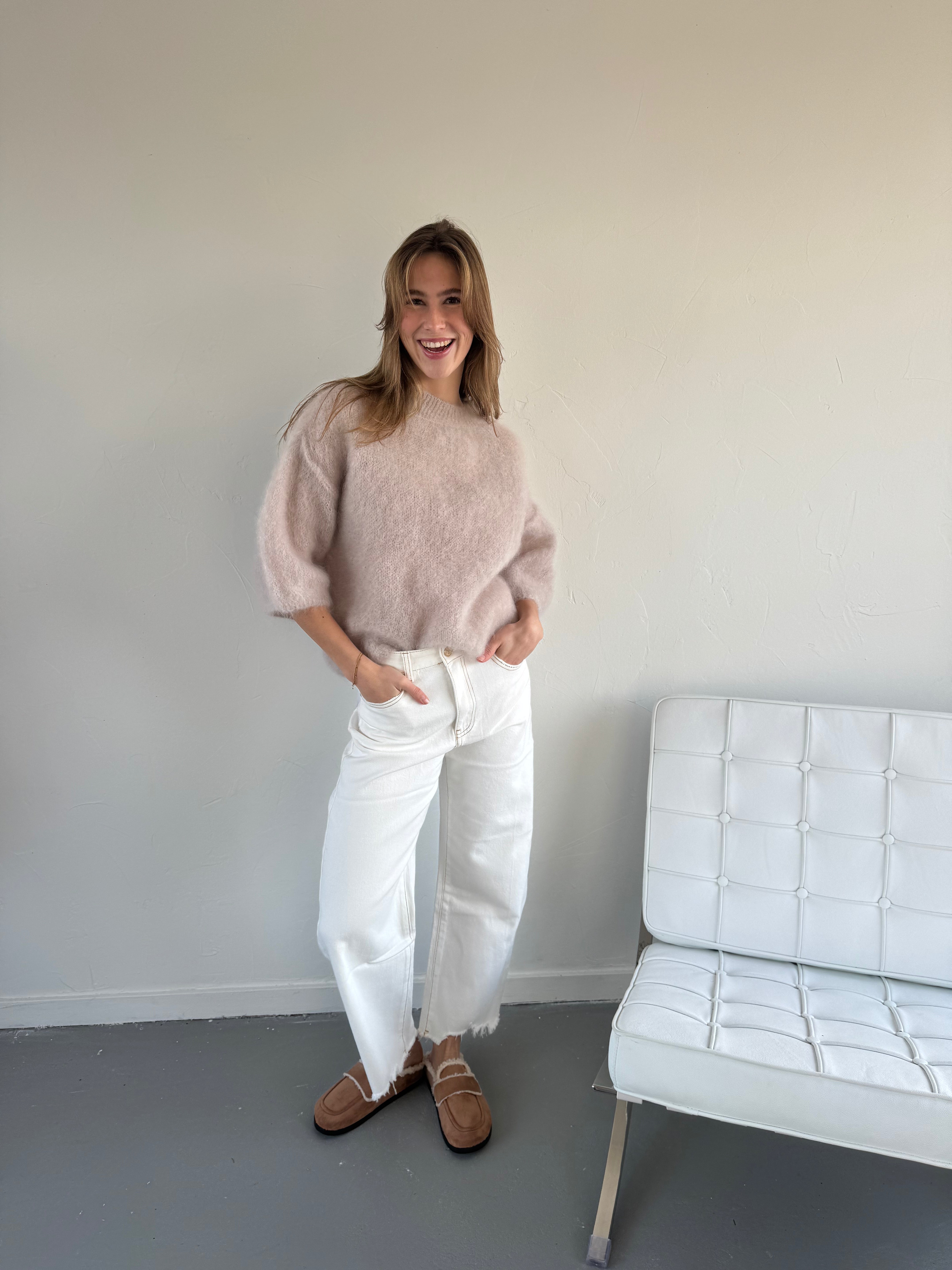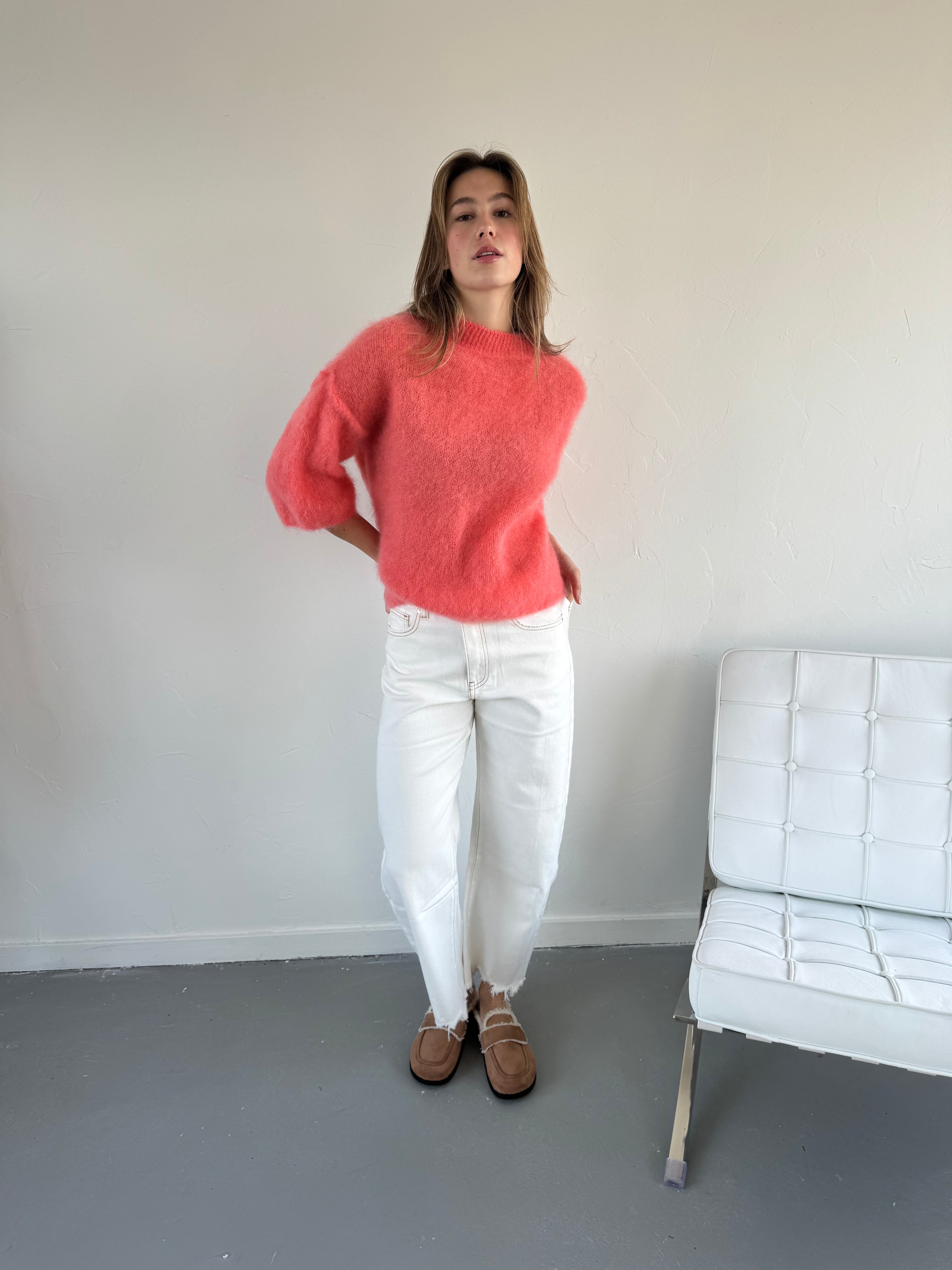 Zachte en luchtige trui van mohairblend met elegante 3/4 mouwen. De fijne, harige structuur geeft een luxe uitstraling en voelt comfortabel aan op de huid. Door de iets kortere mouw is deze trui perfect voor het tussenseizoen en ideaal om zowel casual als gekleed te dragen. Mooi te combineren met een pantalon, rok of jeans voor een moeiteloos stijlvolle look.