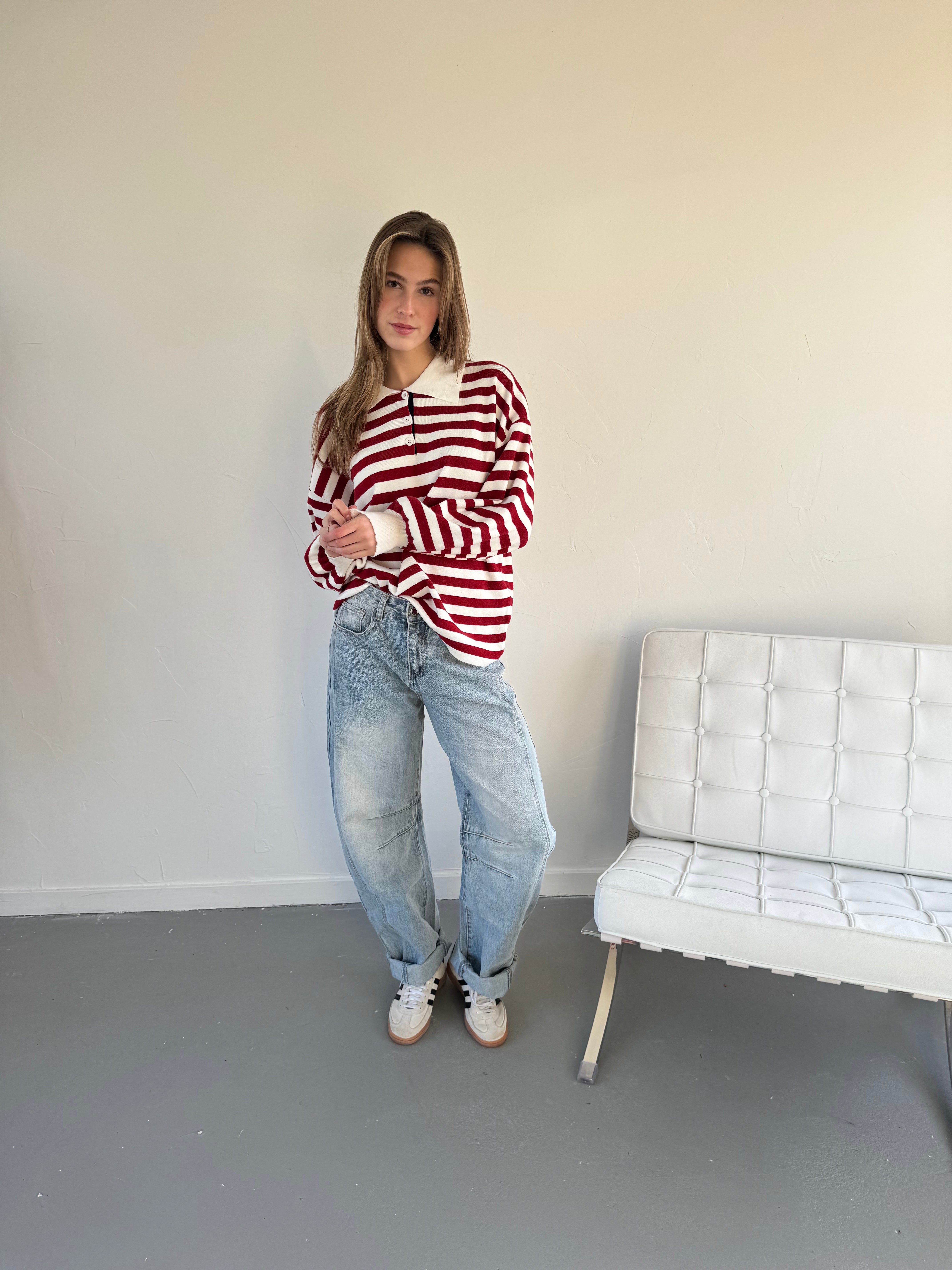 Deze gebreide polo is een echte preppy classic met een moderne twist. De zachte knitstof zit heerlijk en de gestreepte details geven de top een sportieve, stijlvolle look. Perfect voor een casual chic outfit — combineer ’m met jeans, een pantalon of een rok voor een effortless, classy vibe.