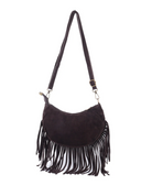Leder suède schoudertas met franjes. De tas heeft een verstelbare en afneembare schouderband.
