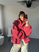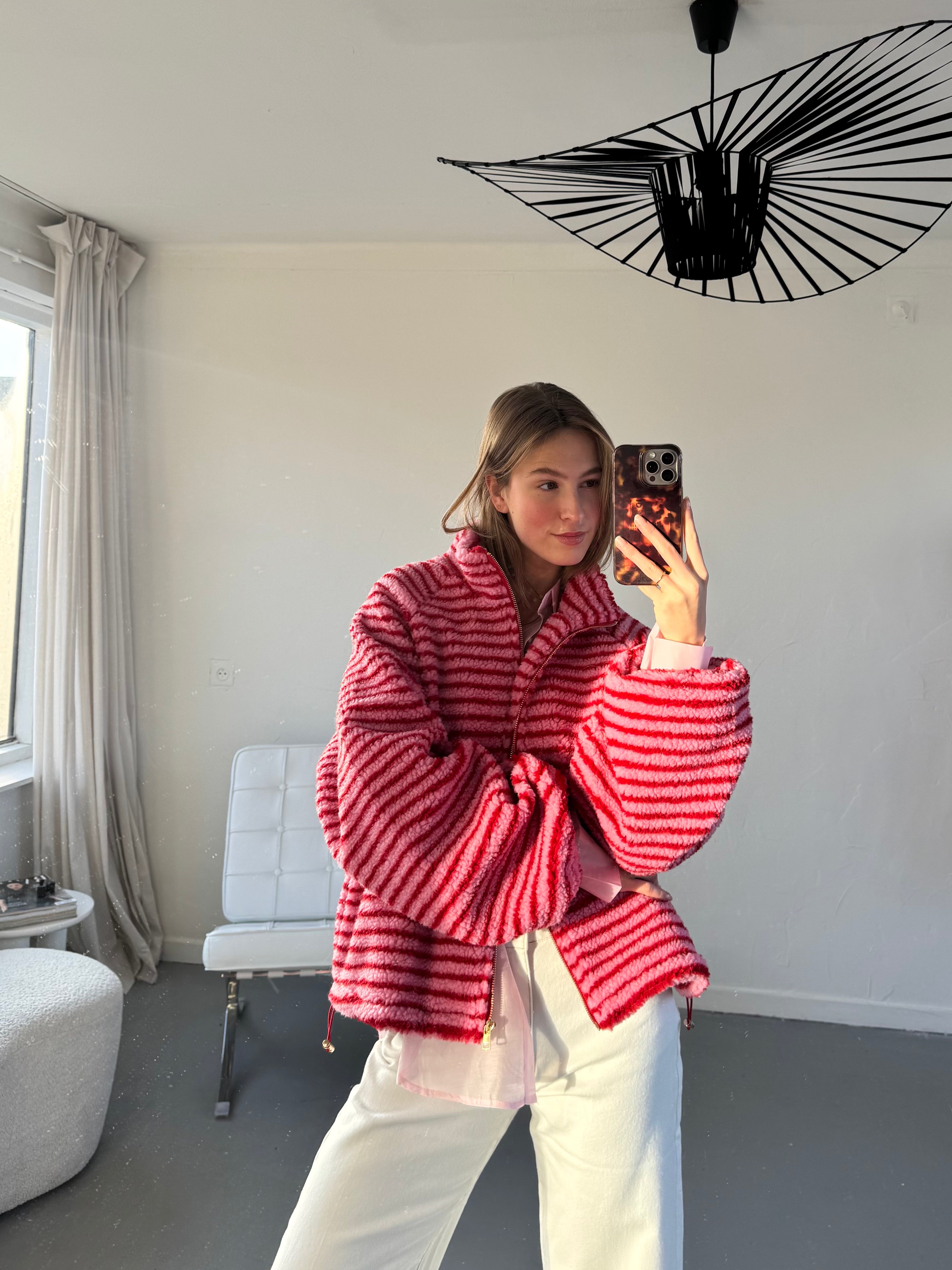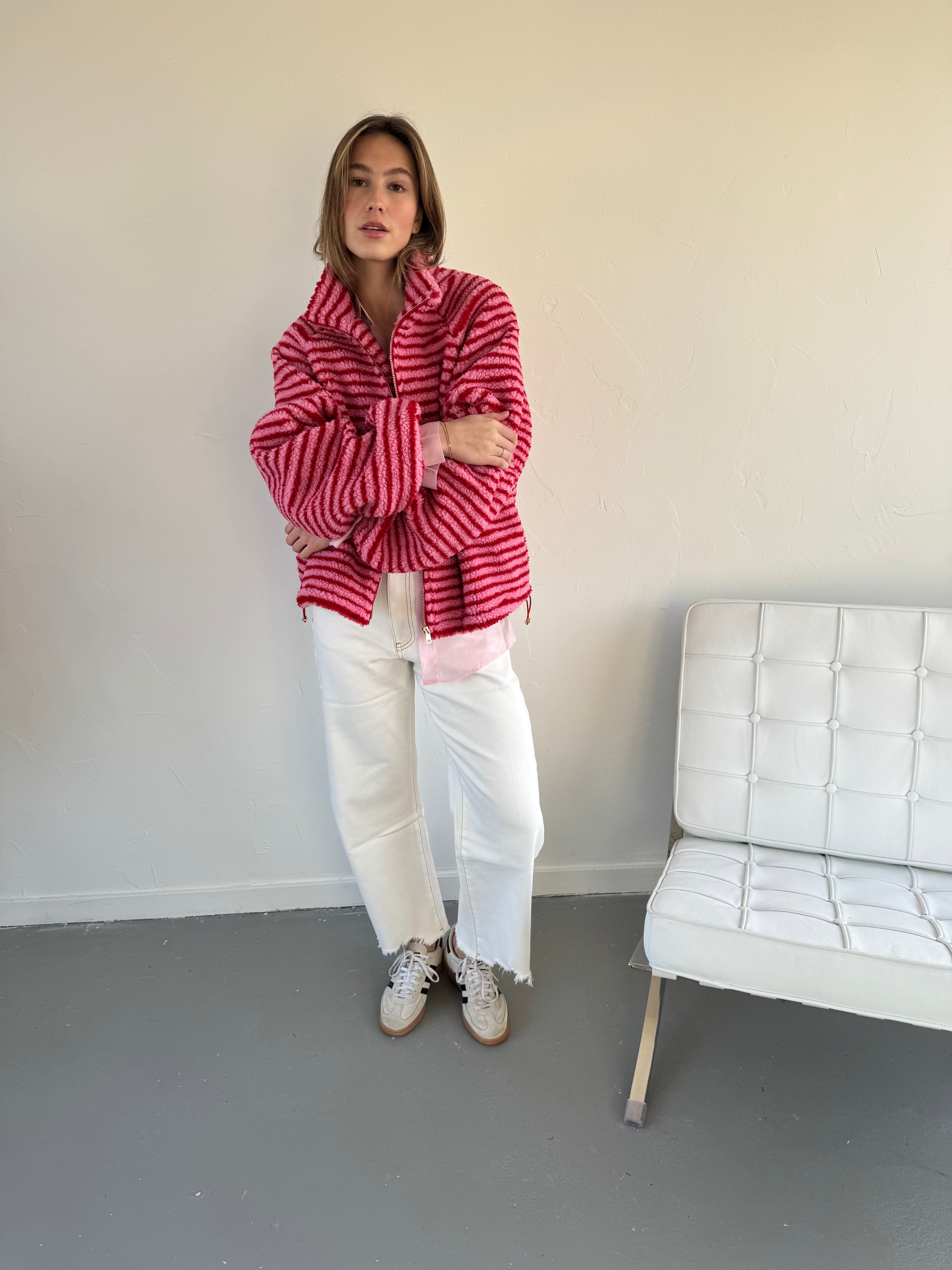 Comfortabel teddy vest met een speels streeppatroon. Gemaakt van een zachte, warme teddykwaliteit die heerlijk aanvoelt en zorgt voor een cozy uitstraling. Het vest is ideaal voor frisse dagen en perfect om casual outfits net dat beetje extra te geven. Mooi te combineren met een jeans, pantalon of over een basic top voor een relaxte, trendy look.