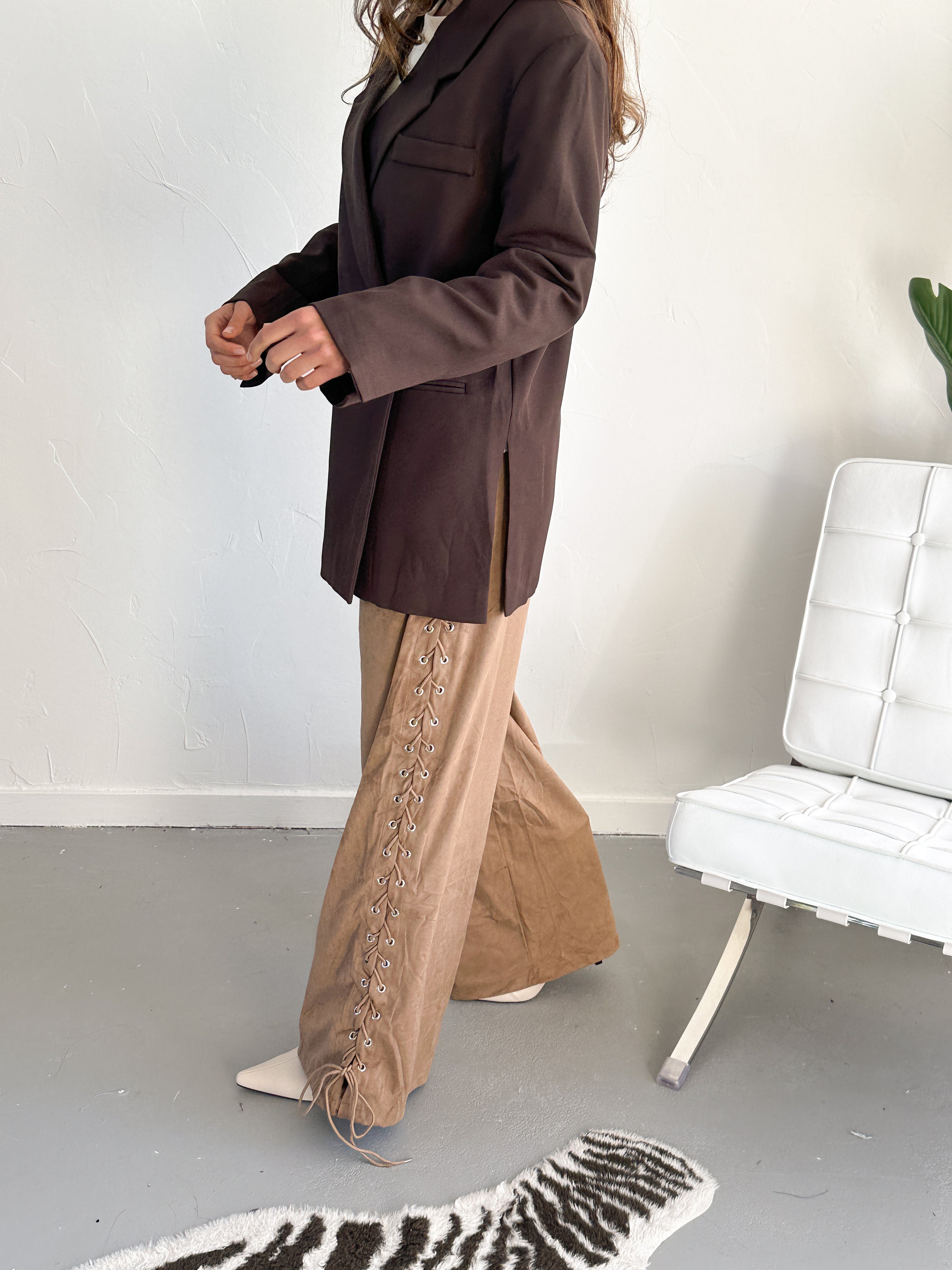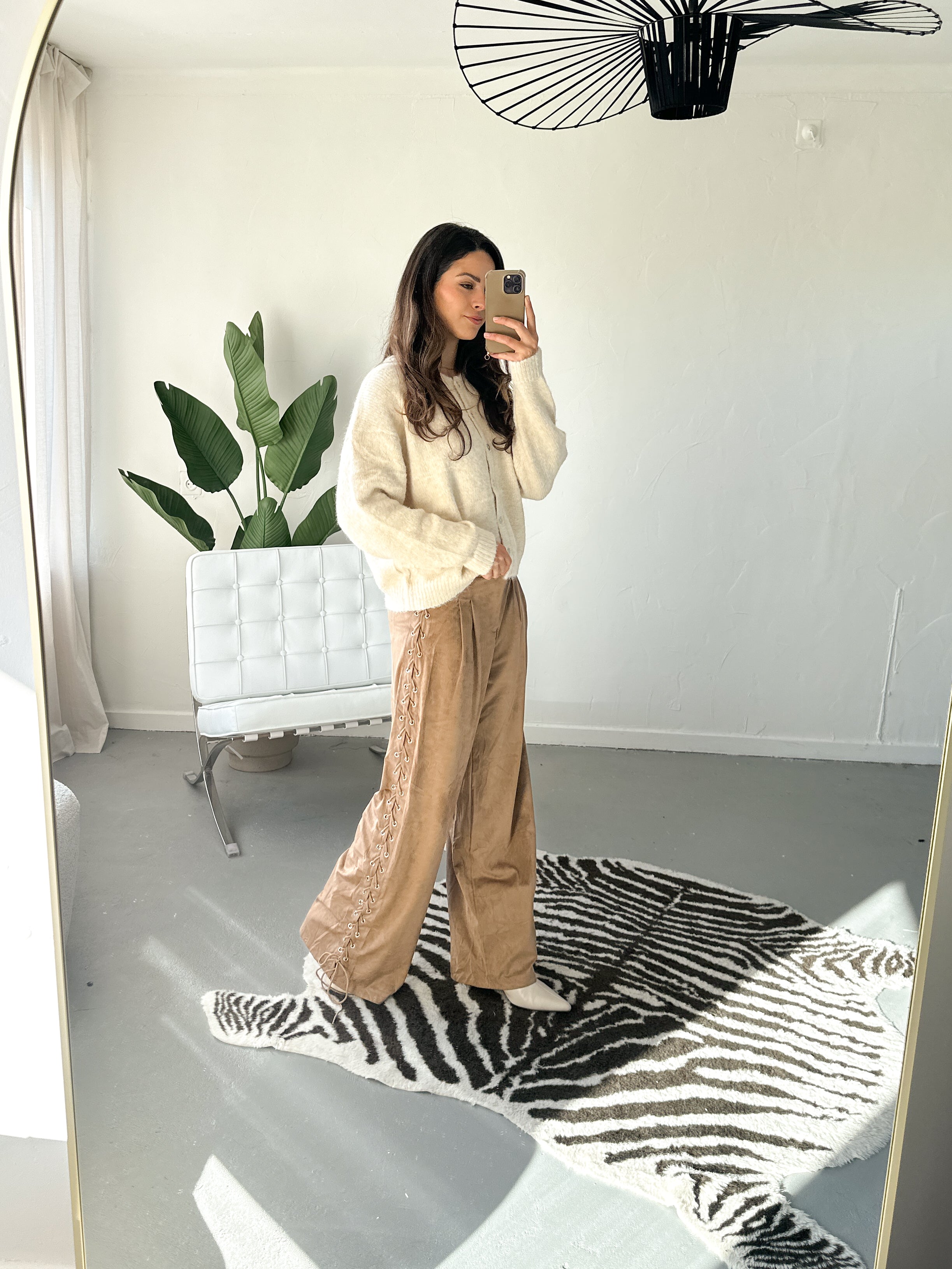 Deze suèdelook broek met rechte fit en gevlochten zijkant is een echte eyecatcher. De zachte stof geeft ‘m een luxe uitstraling, terwijl de veters zorgen voor een speelse touch. Perfect om te combineren met een basic top, knit of blazer.